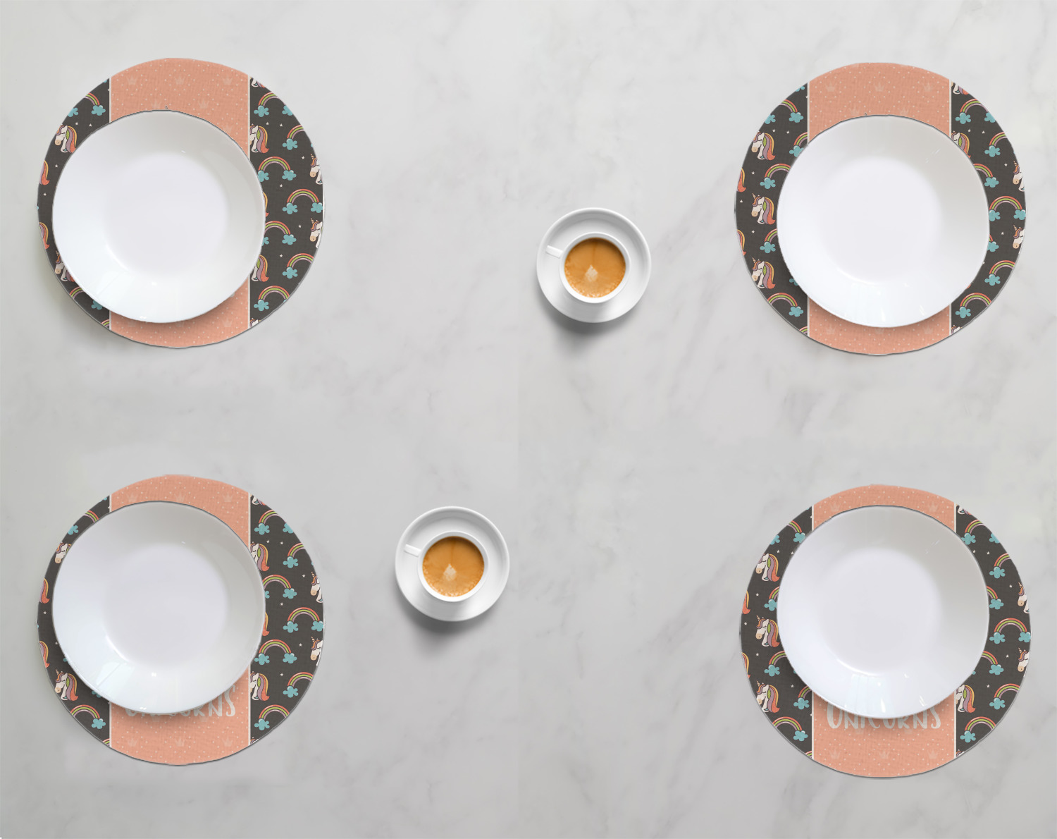 This fun unicorn design has a dark grey background with brightly colored unicorns and rainbows all across it.This pattern is on either side of a peach background with subtle crowns on it. Front and center is a fun saying that says "Charlie Believes In Unicorns" where "Charlie" can be replaced with your name. On the top of this text is a majestic leaping unicorn.