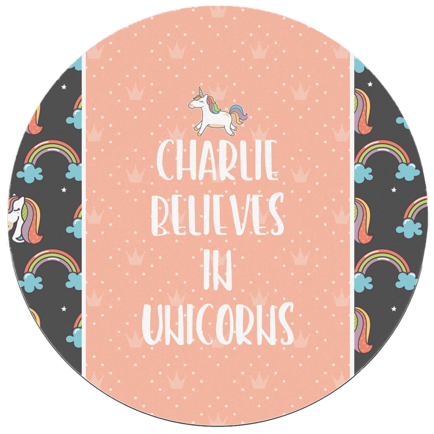 This fun unicorn design has a dark grey background with brightly colored unicorns and rainbows all across it.This pattern is on either side of a peach background with subtle crowns on it. Front and center is a fun saying that says "Charlie Believes In Unicorns" where "Charlie" can be replaced with your name. On the top of this text is a majestic leaping unicorn.