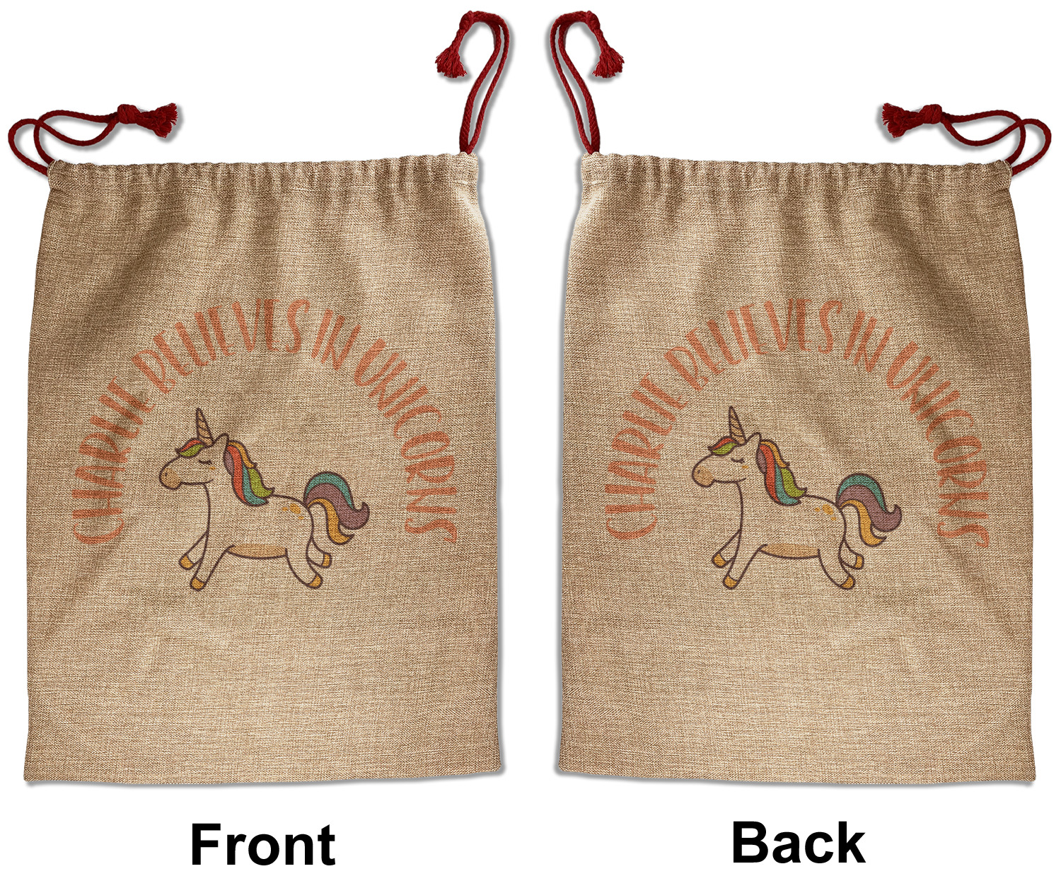 Our Santa sacks print your design on the burlap material giving it a nice rustic, natural design! The burlap material is also machine washable and wrinkle-free, so feel free to fold and store out Santa bags until the next time you need it! Secure your gifts with our red accent drawstring ties at the top of the sack so the mystery of your gift stays a surprise until Christmas day. We offer two types of printing- one side partial print or double-sided partial printing. Design and personalize your own Santa sack in time for the holidays!