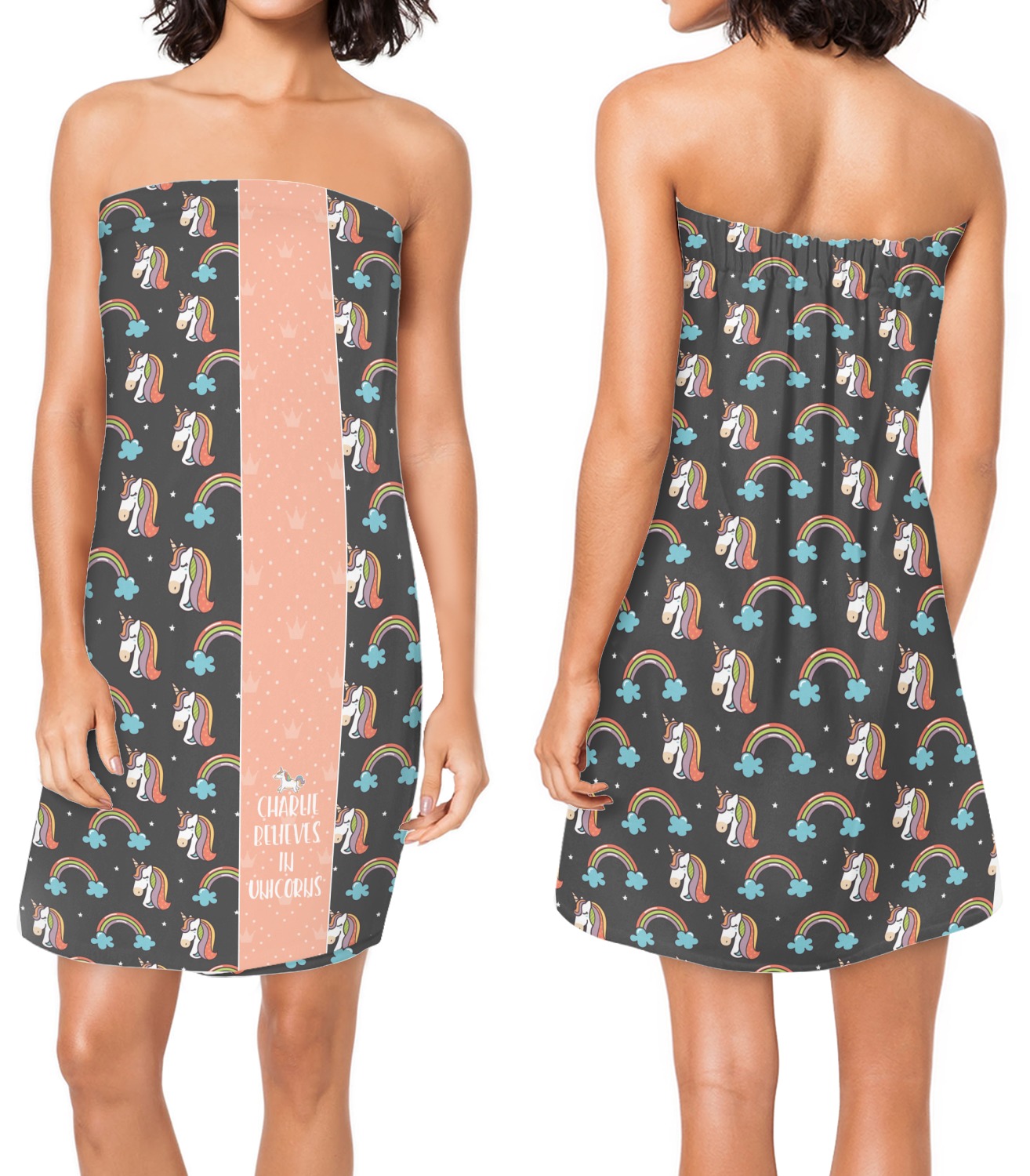 This fun unicorn design has a dark grey background with brightly colored unicorns and rainbows all across it.This pattern is on either side of a peach background with subtle crowns on it. Front and center is a fun saying that says "Charlie Believes In Unicorns" where "Charlie" can be replaced with your name. On the top of this text is a majestic leaping unicorn.