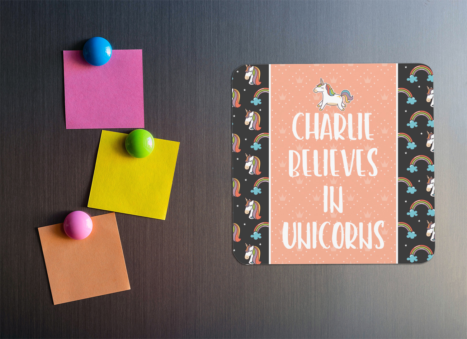 This fun unicorn design has a dark grey background with brightly colored unicorns and rainbows all across it.This pattern is on either side of a peach background with subtle crowns on it. Front and center is a fun saying that says "Charlie Believes In Unicorns" where "Charlie" can be replaced with your name. On the top of this text is a majestic leaping unicorn.