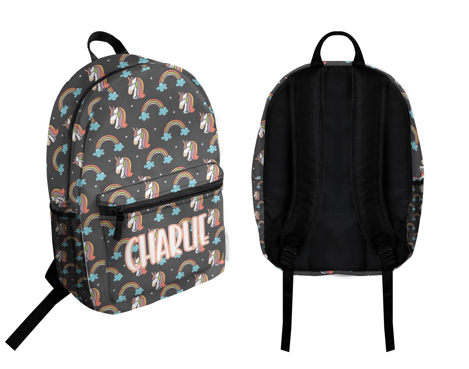 This fun unicorn design has a dark grey background with brightly colored unicorns and rainbows all across it.This pattern is on either side of a peach background with subtle crowns on it. Front and center is a fun saying that says "Charlie Believes In Unicorns" where "Charlie" can be replaced with your name. On the top of this text is a majestic leaping unicorn.