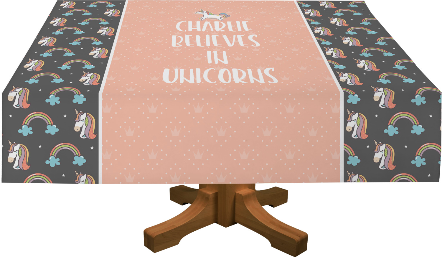 This fun unicorn design has a dark grey background with brightly colored unicorns and rainbows all across it.This pattern is on either side of a peach background with subtle crowns on it. Front and center is a fun saying that says "Charlie Believes In Unicorns" where "Charlie" can be replaced with your name. On the top of this text is a majestic leaping unicorn.