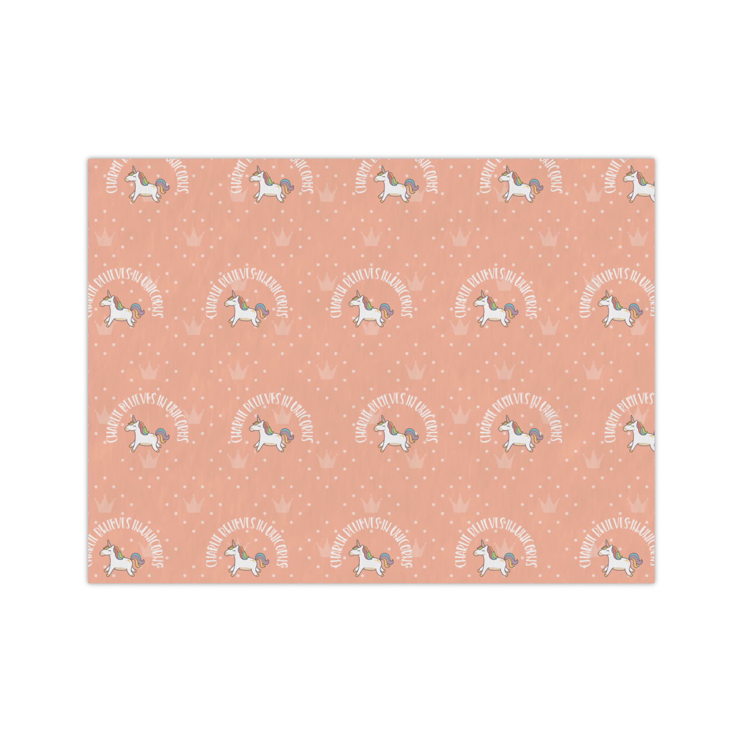 This fun unicorn design has a dark grey background with brightly colored unicorns and rainbows all across it.This pattern is on either side of a peach background with subtle crowns on it. Front and center is a fun saying that says "Charlie Believes In Unicorns" where "Charlie" can be replaced with your name. On the top of this text is a majestic leaping unicorn.