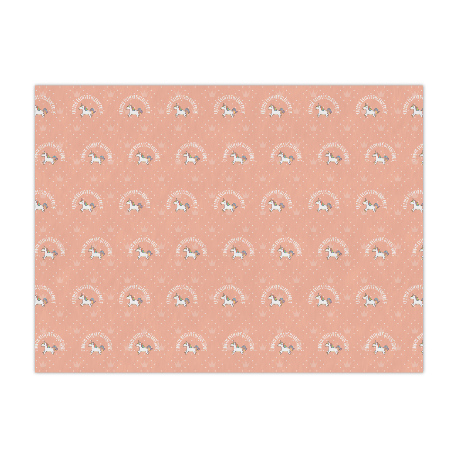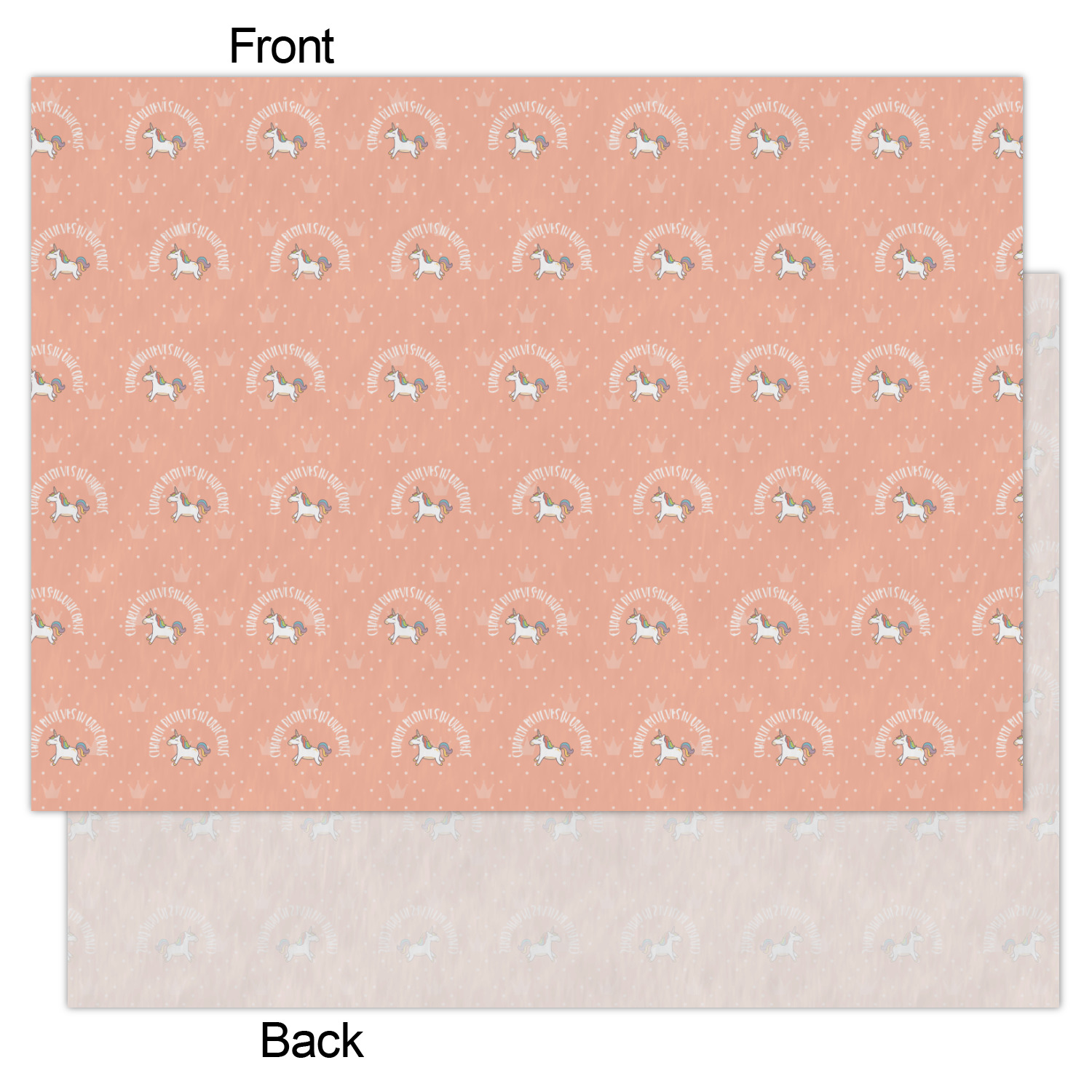 This fun unicorn design has a dark grey background with brightly colored unicorns and rainbows all across it.This pattern is on either side of a peach background with subtle crowns on it. Front and center is a fun saying that says "Charlie Believes In Unicorns" where "Charlie" can be replaced with your name. On the top of this text is a majestic leaping unicorn.