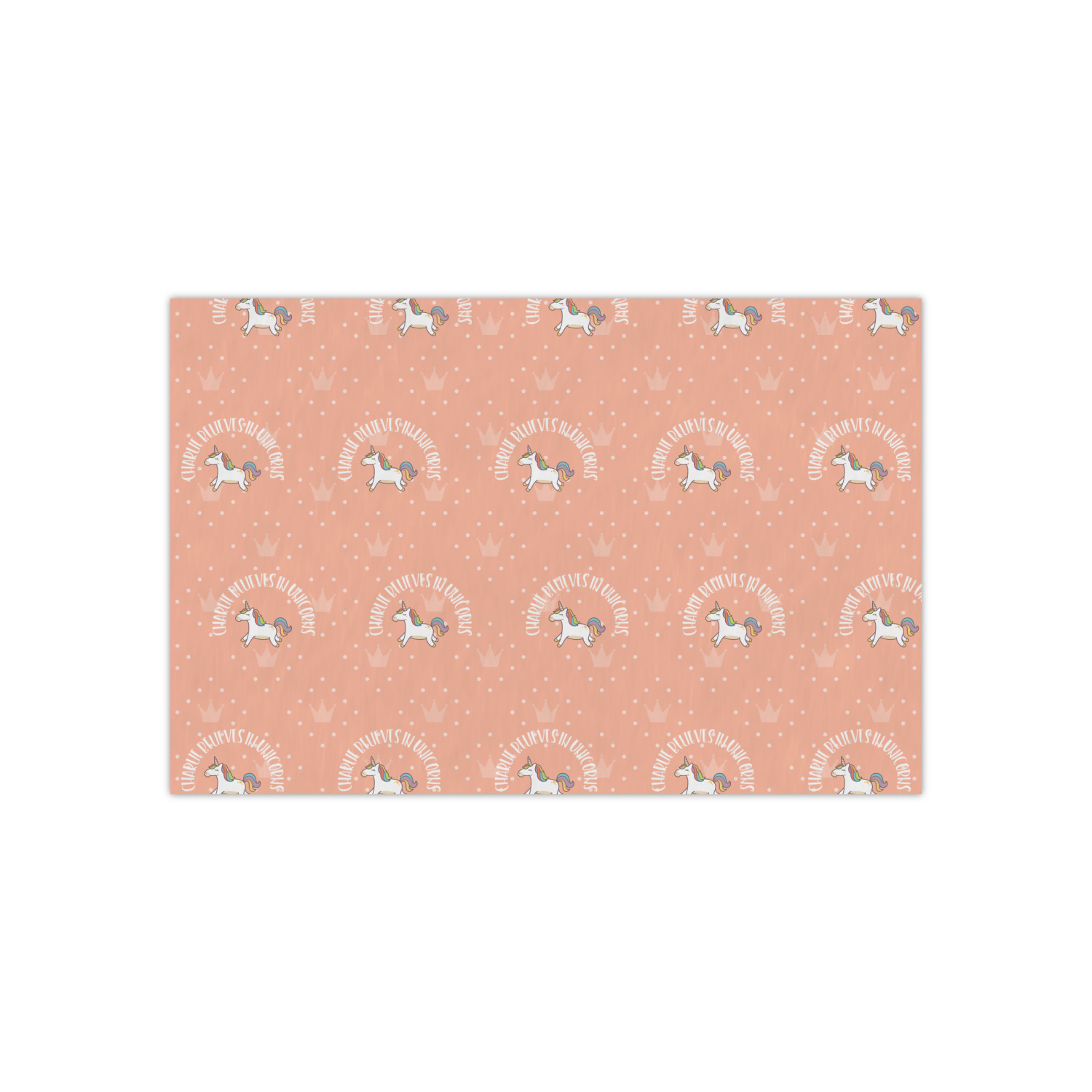 This fun unicorn design has a dark grey background with brightly colored unicorns and rainbows all across it.This pattern is on either side of a peach background with subtle crowns on it. Front and center is a fun saying that says "Charlie Believes In Unicorns" where "Charlie" can be replaced with your name. On the top of this text is a majestic leaping unicorn.