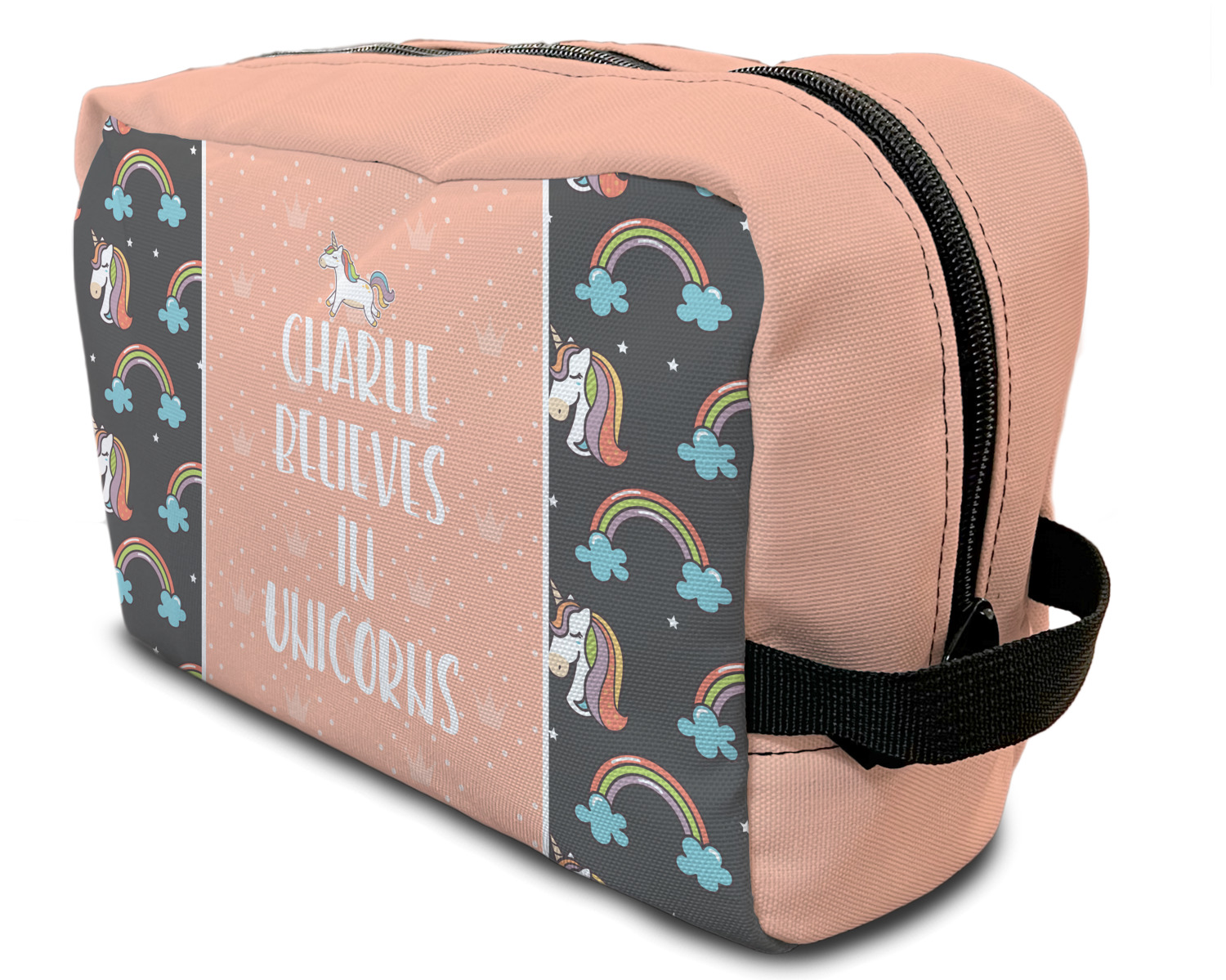 This fun unicorn design has a dark grey background with brightly colored unicorns and rainbows all across it.This pattern is on either side of a peach background with subtle crowns on it. Front and center is a fun saying that says "Charlie Believes In Unicorns" where "Charlie" can be replaced with your name. On the top of this text is a majestic leaping unicorn.