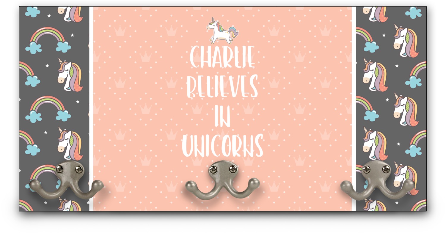 This fun unicorn design has a dark grey background with brightly colored unicorns and rainbows all across it.This pattern is on either side of a peach background with subtle crowns on it. Front and center is a fun saying that says "Charlie Believes In Unicorns" where "Charlie" can be replaced with your name. On the top of this text is a majestic leaping unicorn.