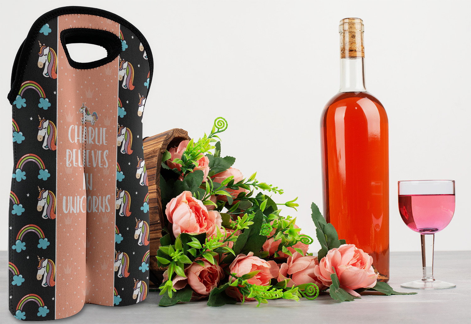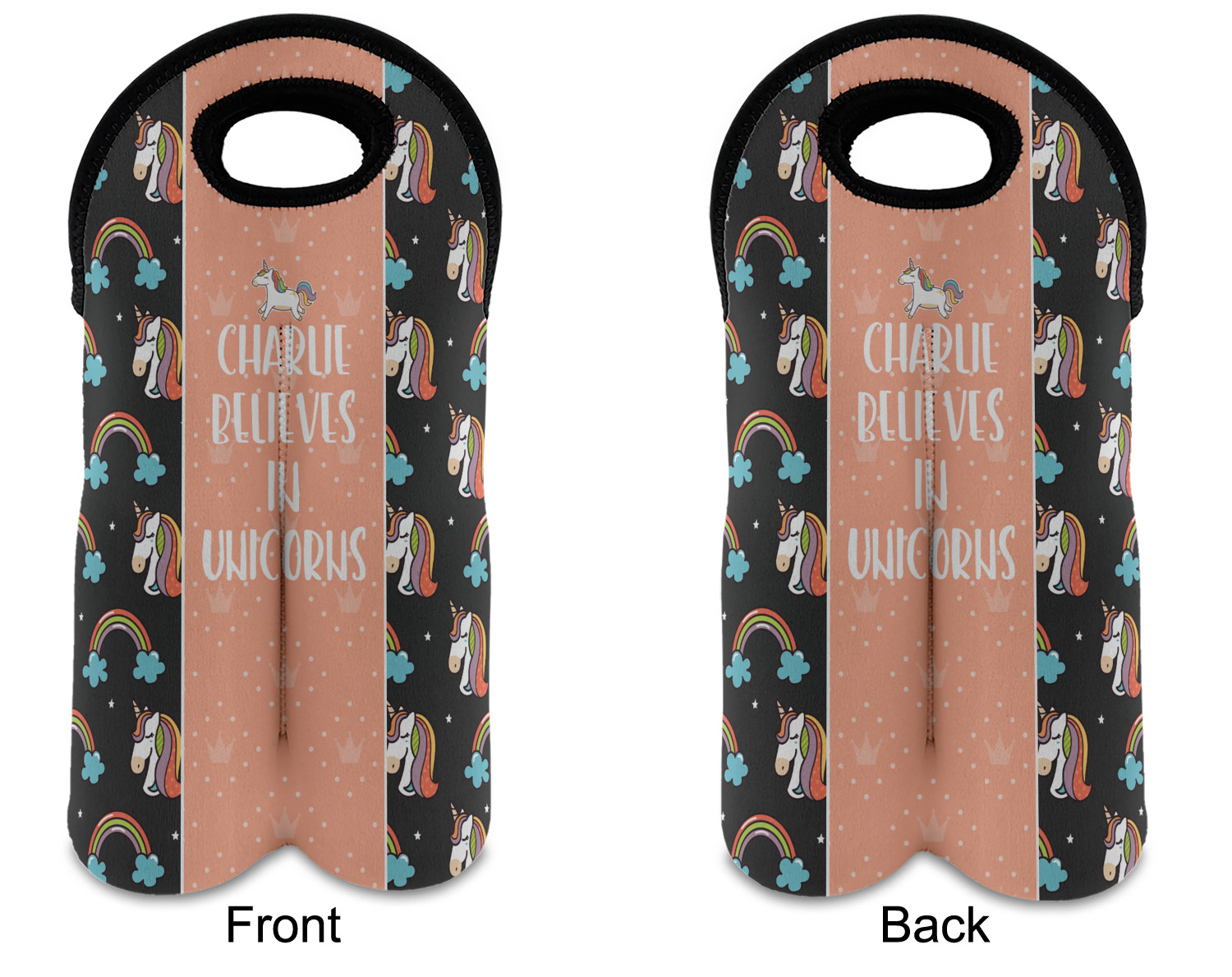 These tote bags are insulated to keep the bottles cold and have a stitched separation down the middle and double handles to keep the two bottles safe and secure during travels.