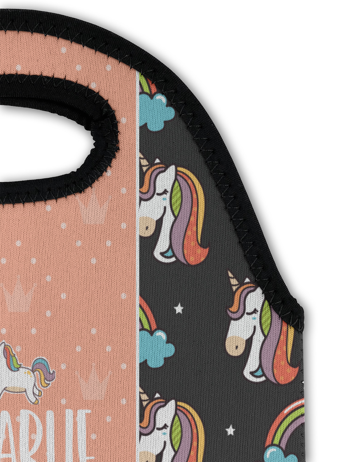 This fun unicorn design has a dark grey background with brightly colored unicorns and rainbows all across it.This pattern is on either side of a peach background with subtle crowns on it. Front and center is a fun saying that says "Charlie Believes In Unicorns" where "Charlie" can be replaced with your name. On the top of this text is a majestic leaping unicorn.