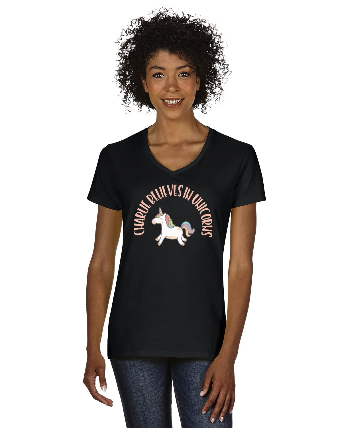 This fun unicorn design has a dark grey background with brightly colored unicorns and rainbows all across it.This pattern is on either side of a peach background with subtle crowns on it. Front and center is a fun saying that says "Charlie Believes In Unicorns" where "Charlie" can be replaced with your name. On the top of this text is a majestic leaping unicorn.