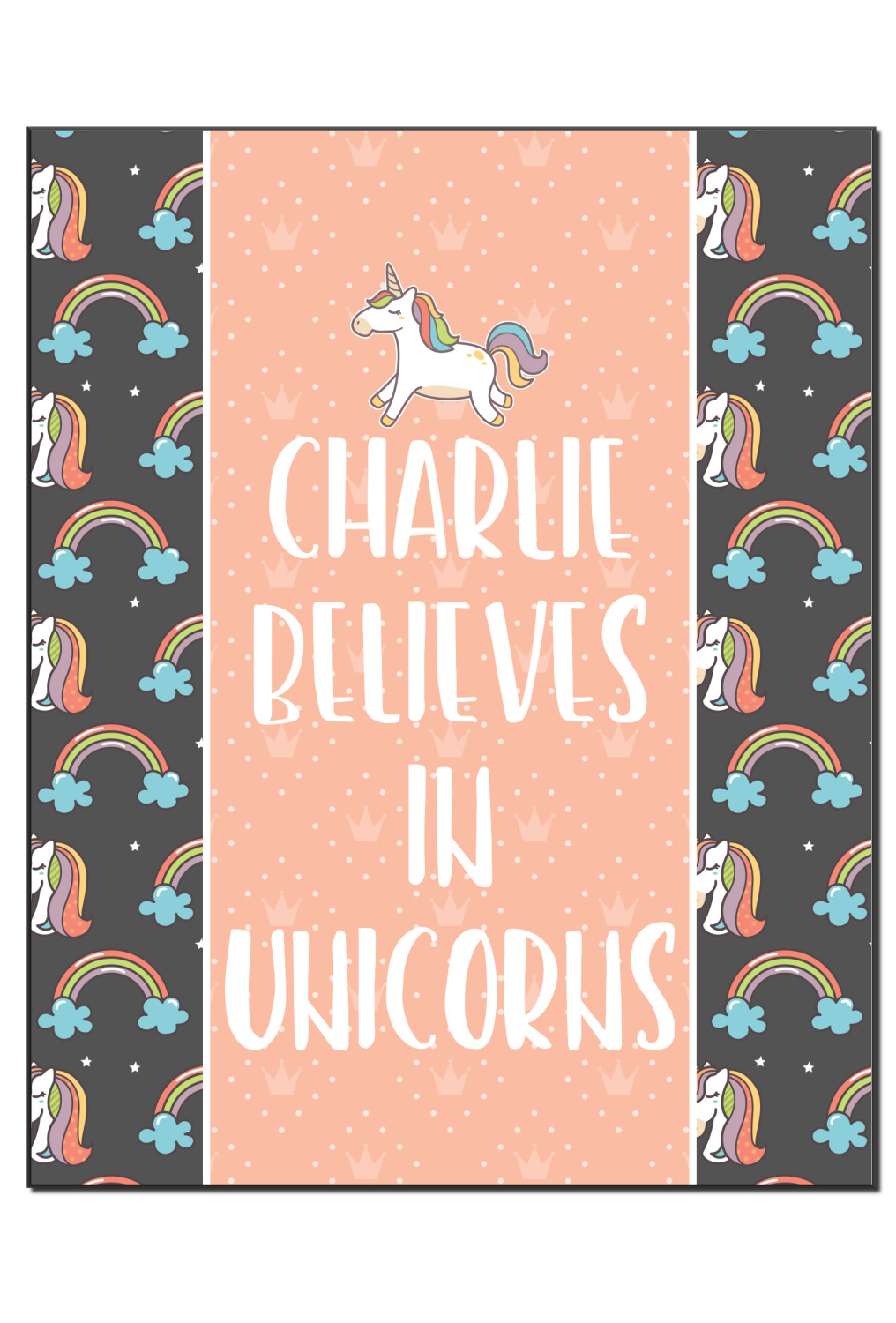 This fun unicorn design has a dark grey background with brightly colored unicorns and rainbows all across it.This pattern is on either side of a peach background with subtle crowns on it. Front and center is a fun saying that says "Charlie Believes In Unicorns" where "Charlie" can be replaced with your name. On the top of this text is a majestic leaping unicorn.