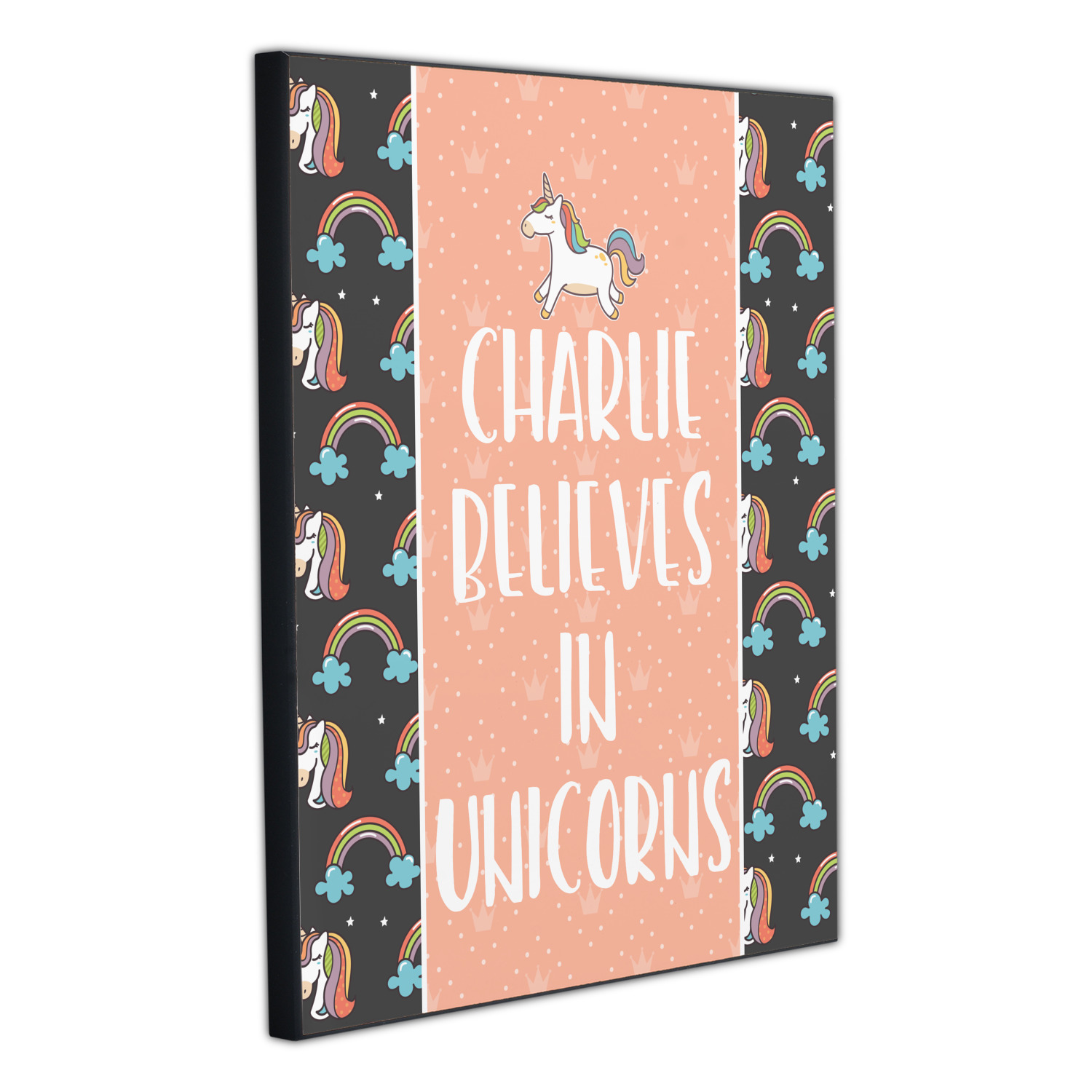 This fun unicorn design has a dark grey background with brightly colored unicorns and rainbows all across it.This pattern is on either side of a peach background with subtle crowns on it. Front and center is a fun saying that says "Charlie Believes In Unicorns" where "Charlie" can be replaced with your name. On the top of this text is a majestic leaping unicorn.