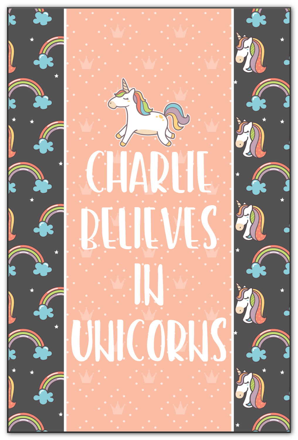 This fun unicorn design has a dark grey background with brightly colored unicorns and rainbows all across it.This pattern is on either side of a peach background with subtle crowns on it. Front and center is a fun saying that says "Charlie Believes In Unicorns" where "Charlie" can be replaced with your name. On the top of this text is a majestic leaping unicorn.
