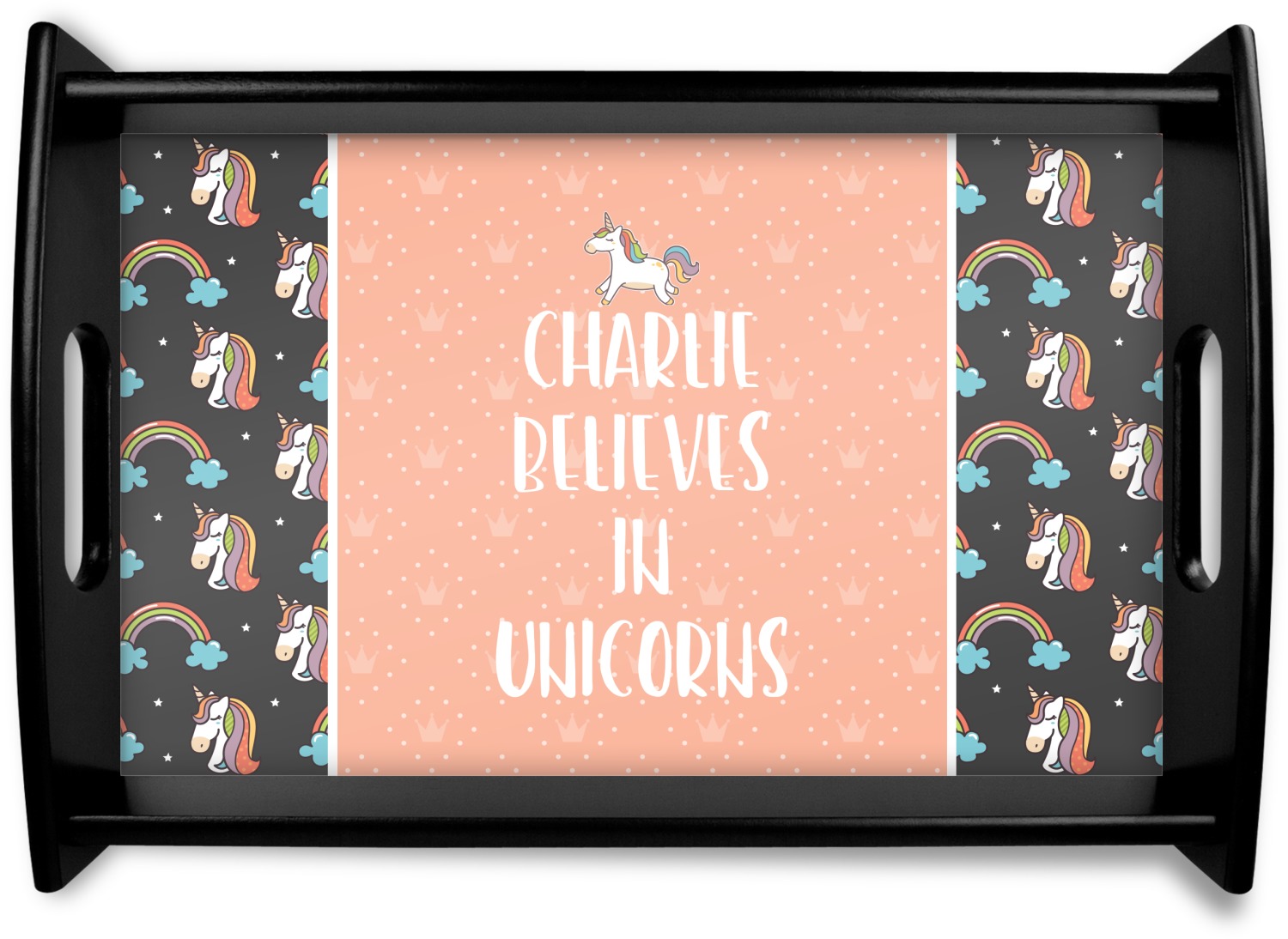 This fun unicorn design has a dark grey background with brightly colored unicorns and rainbows all across it.This pattern is on either side of a peach background with subtle crowns on it. Front and center is a fun saying that says "Charlie Believes In Unicorns" where "Charlie" can be replaced with your name. On the top of this text is a majestic leaping unicorn.