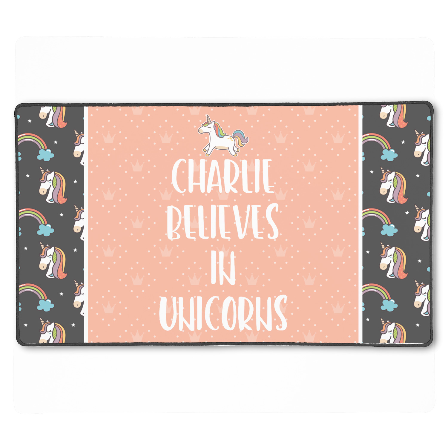 This fun unicorn design has a dark grey background with brightly colored unicorns and rainbows all across it.This pattern is on either side of a peach background with subtle crowns on it. Front and center is a fun saying that says "Charlie Believes In Unicorns" where "Charlie" can be replaced with your name. On the top of this text is a majestic leaping unicorn.