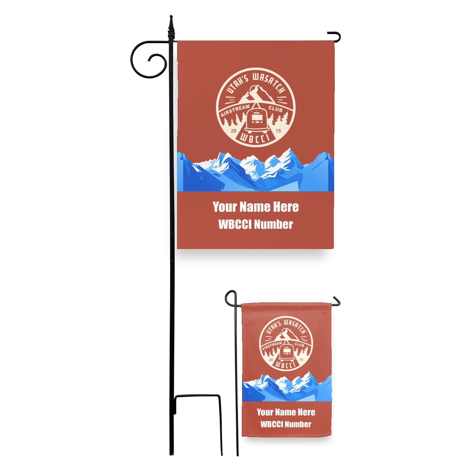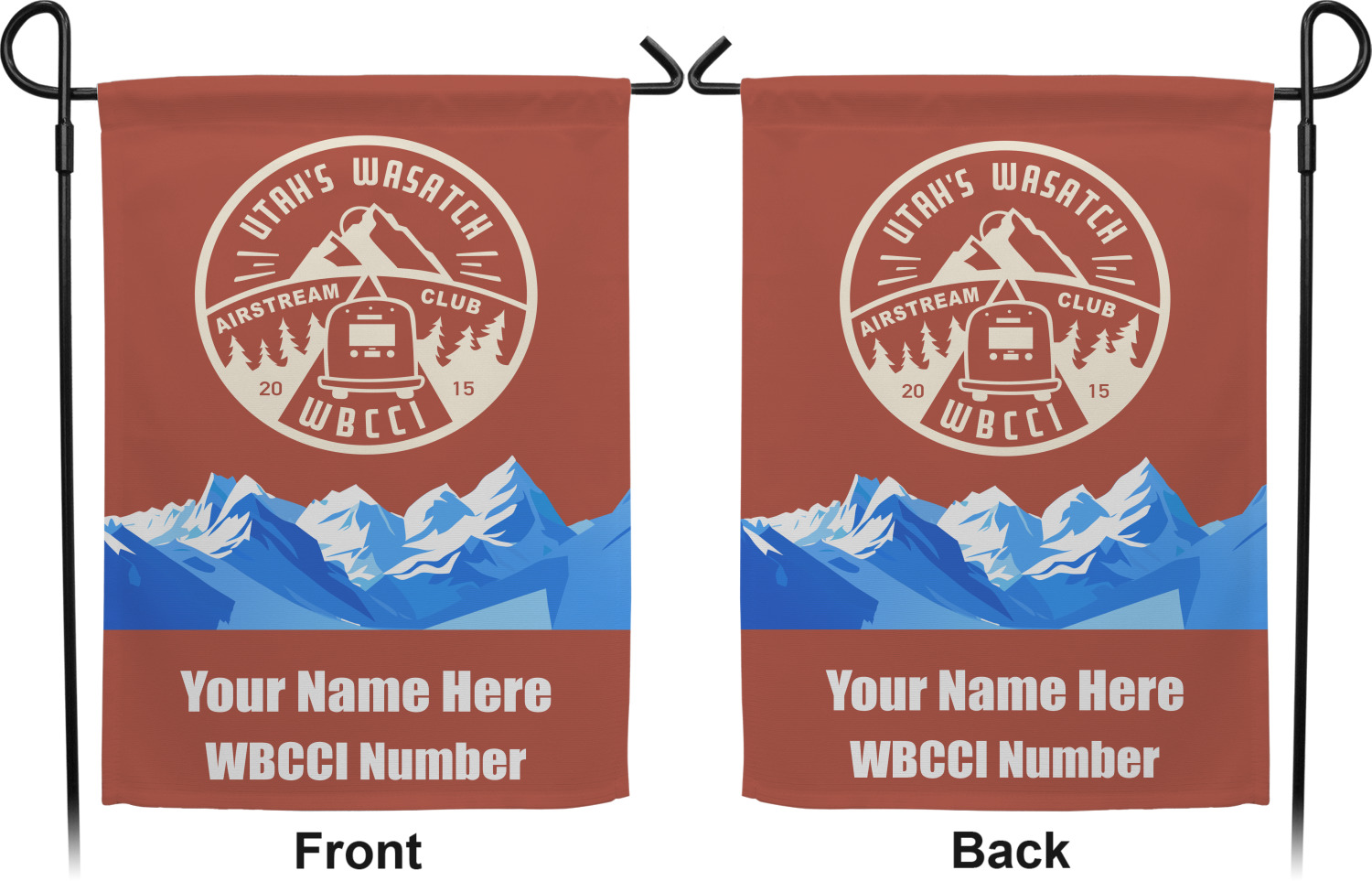 These custom garden flags are made of a durable, double-ply, polyester weave, allowing them to withstand the elements year round. The small flags measure at approximately 12 by 18 inches. The large flags measure out to 28 by 37 inches. You can order these decorative flags with your customization printed on the front only, or the front and back.