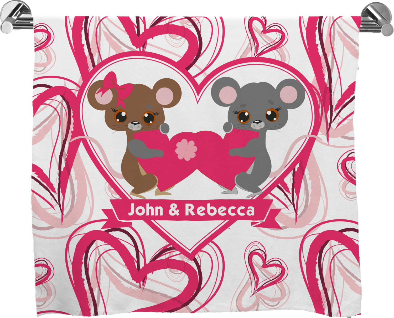These customized bath towels are slightly larger than your standard towel and are the ideal size for wrapping around your body. They measure approximately 60" x 30". Your customization is displayed across the entire front face of the towel, while the back is white.