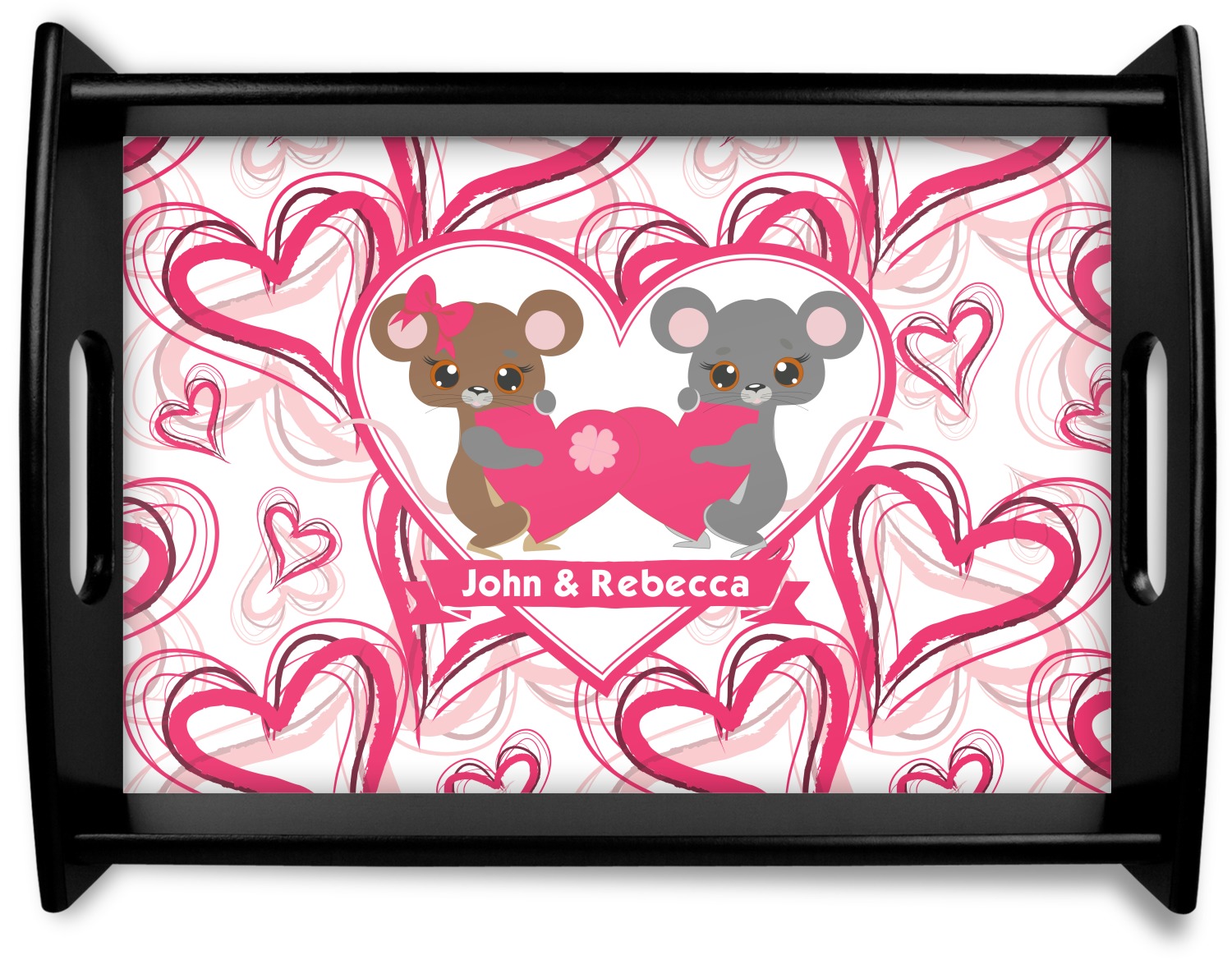 This serving tray with handles features square edges and two rounded sides, creating a very modern look. Each side is fabricated from a beautifully cut, natural wood. The bottom of the interior of the tray displays your customized design in bright, vibrant color. The tray is sold in both a black color and a natural wood look. Each variation of the wood serving tray has two sizes: Small, which is 14" x 10" x 2.25", and Large, which is 19.5" x 13.5" x 2.75".