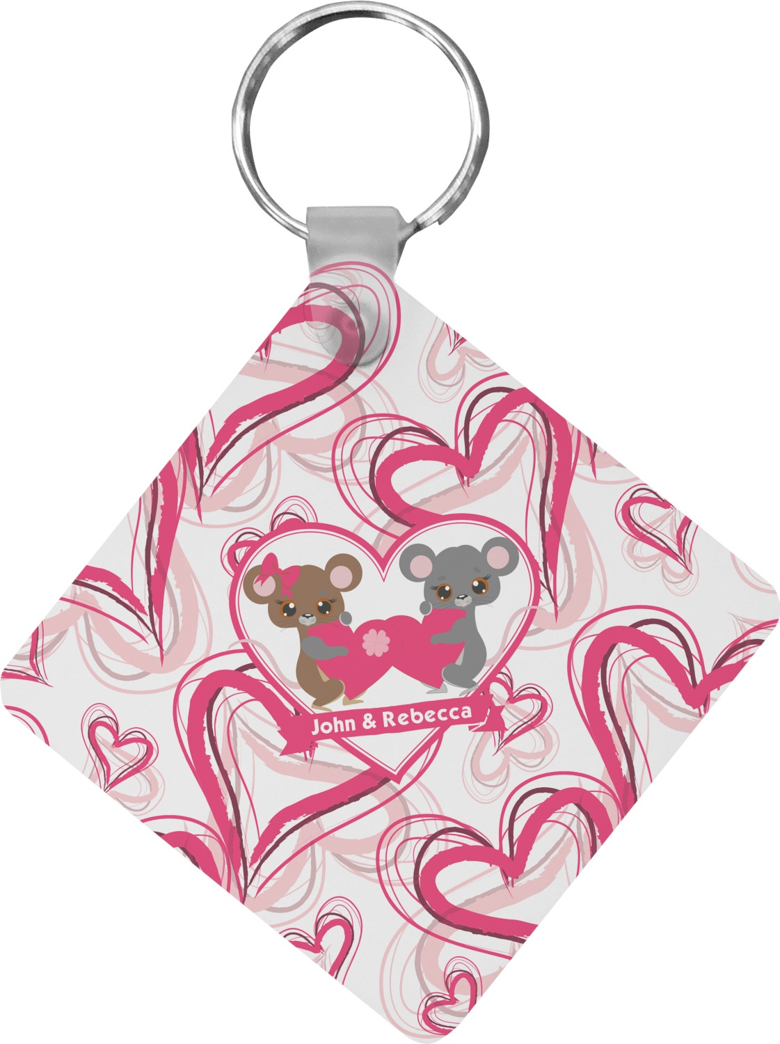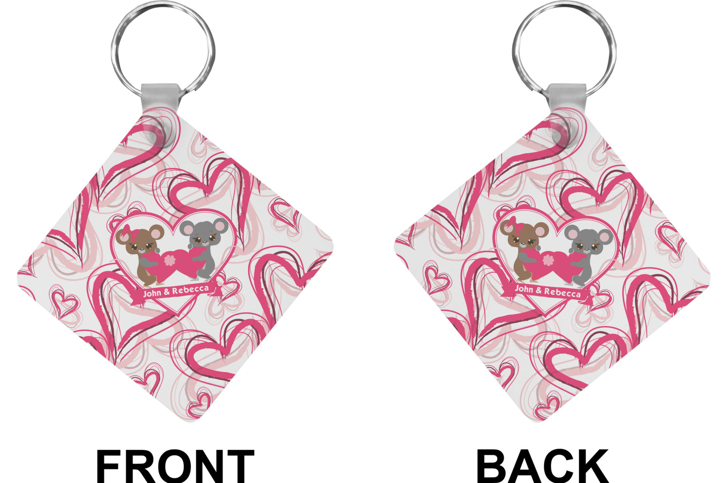 Our personalized keychains attach to the included metal, split key ring with a plastic, removable snap. Since a metal ring is included with your purchase, you have the liberty to keep your keys together on the ring, with or without your unique keychain. We offer this keychain in three different shapes: circle, heart, or diamond. We print your personalized design(s) on both sides of the key chain, and the surface has a glossy, reflective finish that only emphasizes your design. Each keychain is approximately 2.25 by 2.25 inches.