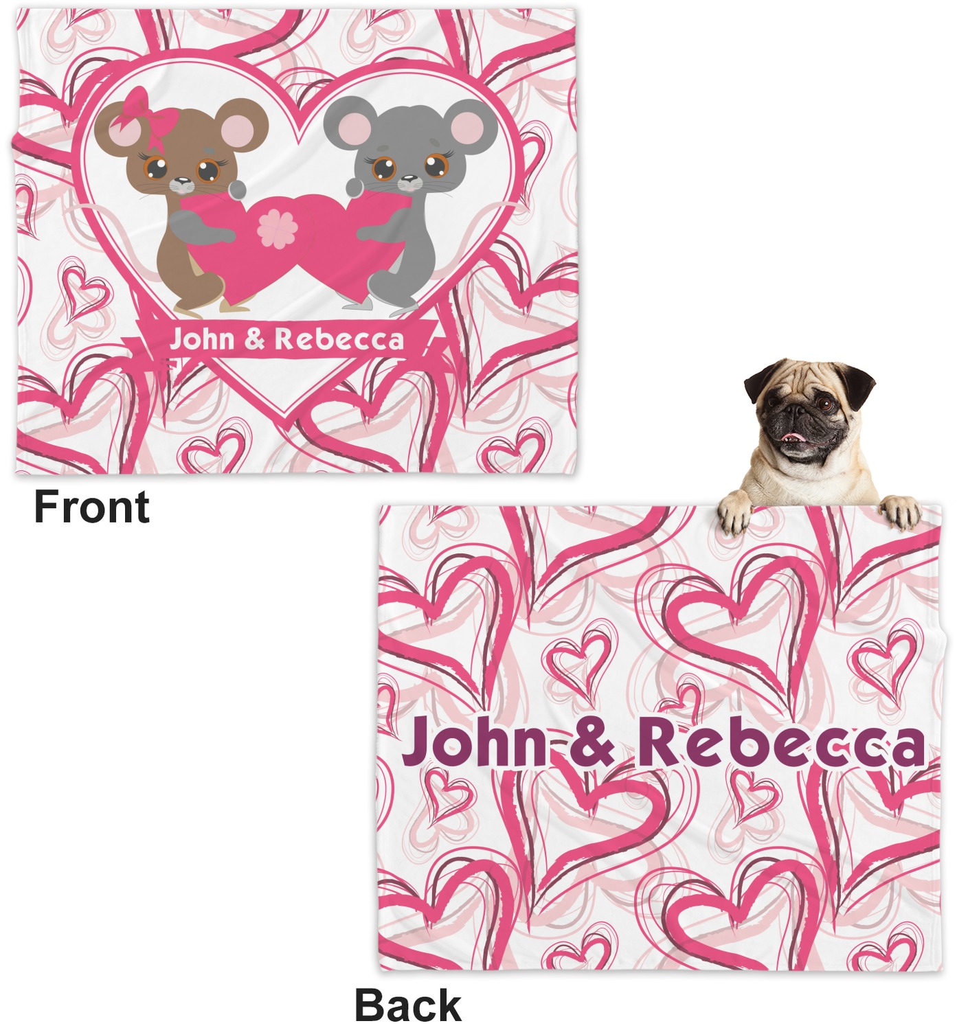 These dog blankets are crafted from a gentle, soft-to-the-touch, minky material. We print your customizations, either matching or differing, on both the top and underside of the blanket. These personalized dog blankets are available in two sizes: regular and large. Our regular size, at 40" x 30", accommodates small and some medium size dogs. At 60" x 50", our large dog blanket is a better fit for bigger breeds. Though specialized for dogs, these blankets still make a thoughtful gift for your favorite feline, or any other pet in mind!