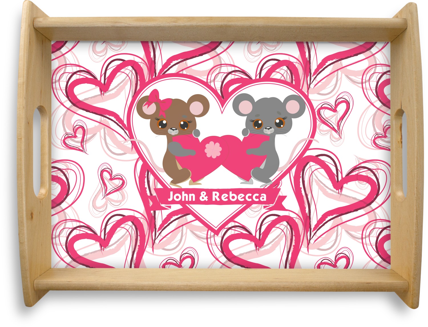 This serving tray with handles features square edges and two rounded sides, creating a very modern look. Each side is fabricated from a beautifully cut, natural wood. The bottom of the interior of the tray displays your customized design in bright, vibrant color. The tray is sold in both a black color and a natural wood look. Each variation of the wood serving tray has two sizes: Small, which is 14" x 10" x 2.25", and Large, which is 19.5" x 13.5" x 2.75".