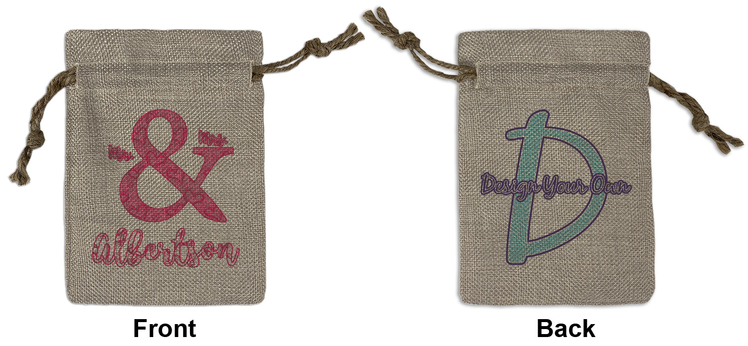 We sell our Burlap Gift Bags in 3 variant sized bags. Made with burlap polyester, each personalized bag can be secured with a twine drawstring pull. Your custom design is available to print on one side or both sides - completely up to you! The sizes of the bags measure approximately 4.5" x 6.5" for the smallest size, 6.5" x 8.0" for the medium size, and 6.5" x 13.5" for the large-sized bag.