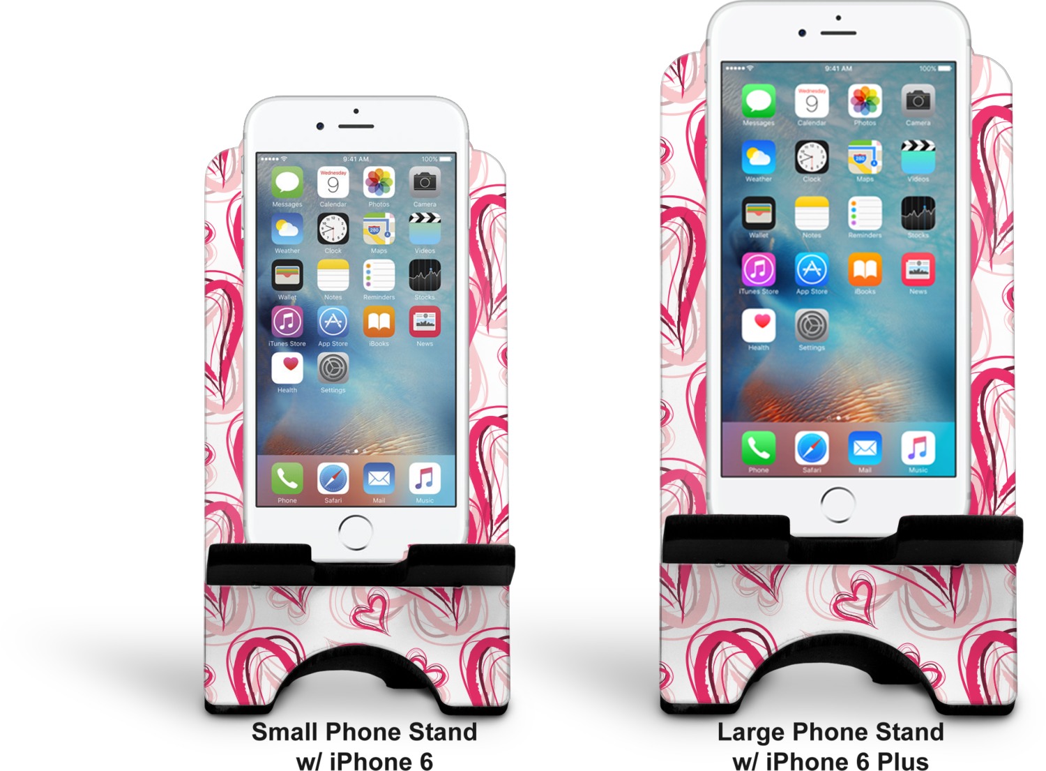To meet your needs, we offer four variations of this IPhone stand. The backboard of the first version is shaped as a plain, yet sleek rectangle, and is available in two sizes. Our smaller size is approximately 4 by 3.25 by 7 inches, while the larger model is 4 by 3.77 by 8.5 inches. Alongside this model, we also provide you with a more decorative option. The upper part of our second version features a curved edge, for a classy, suave appearance. This phone holder is also sold in two sizes: a smaller version, which is 4 by 3.25 by 7 inches, and our larger model, which is 4 by 3.77 by 8.5 inches. Both models will support large phones, but the larger model is better if you wish to proudly display your personalized design.
