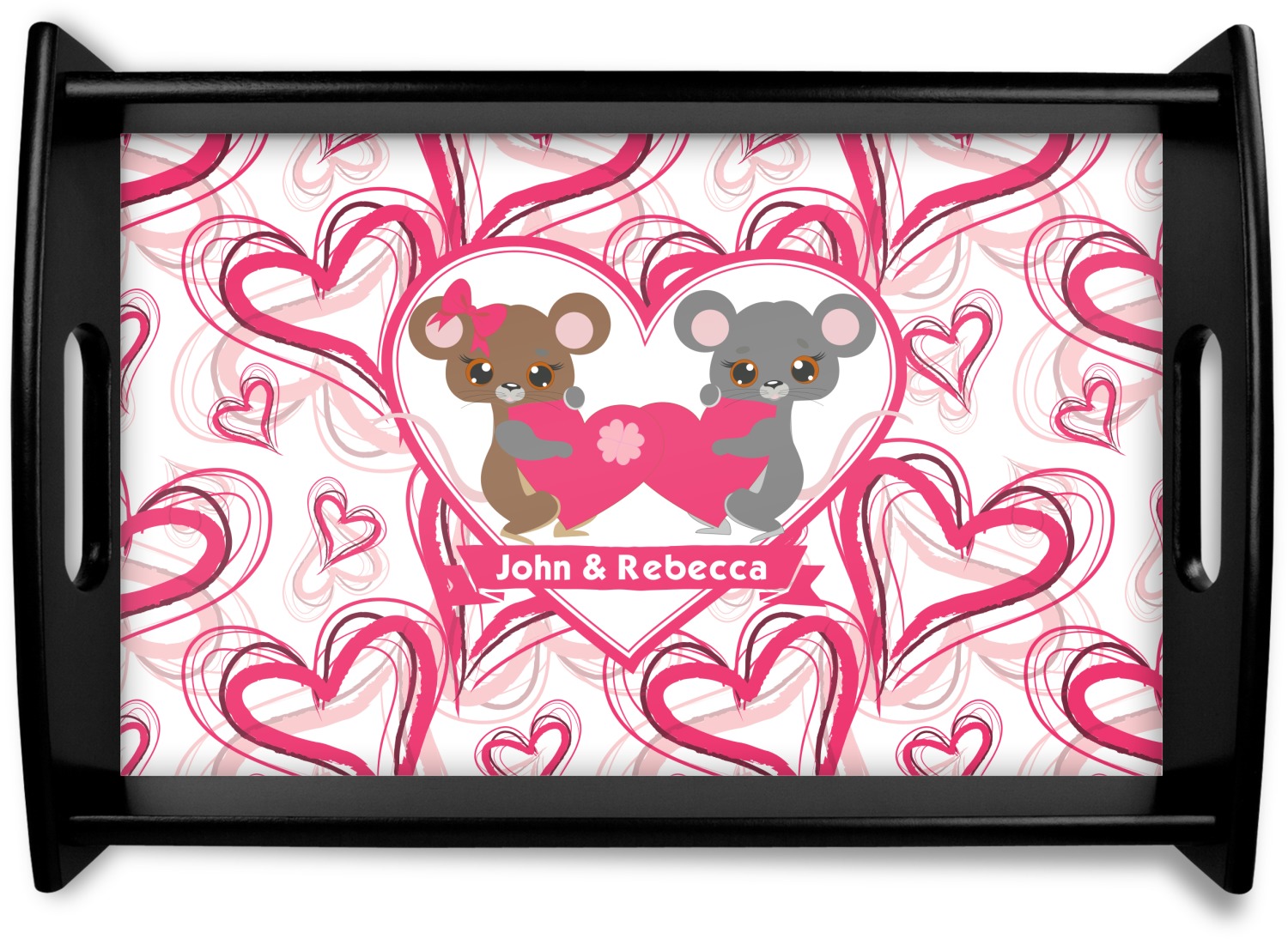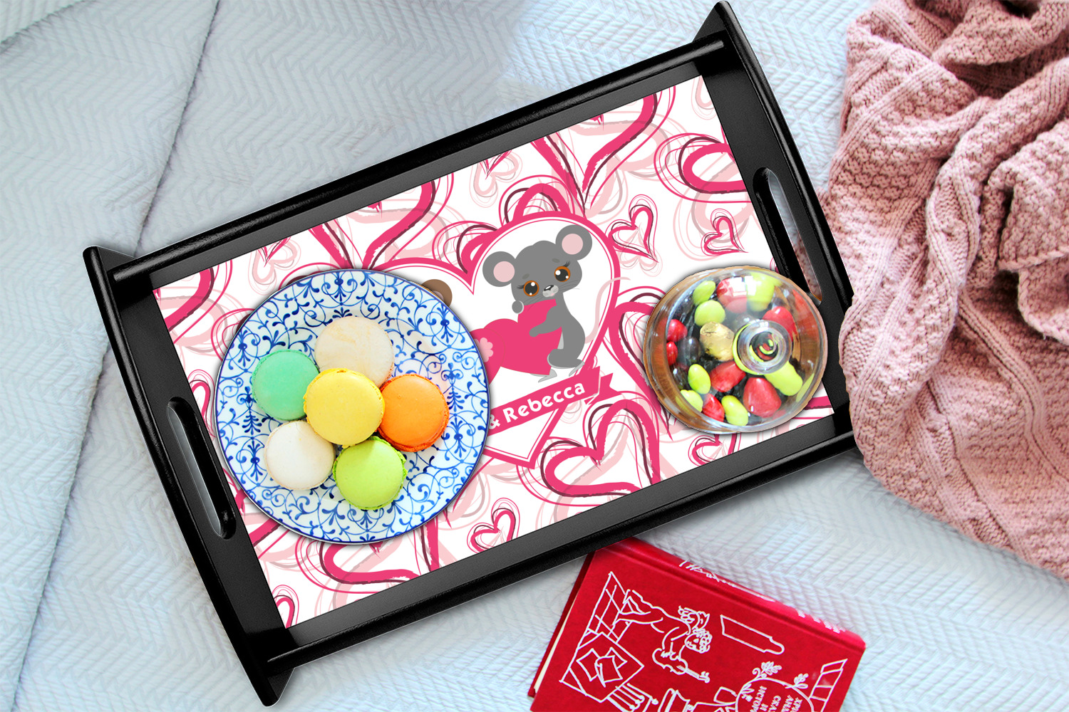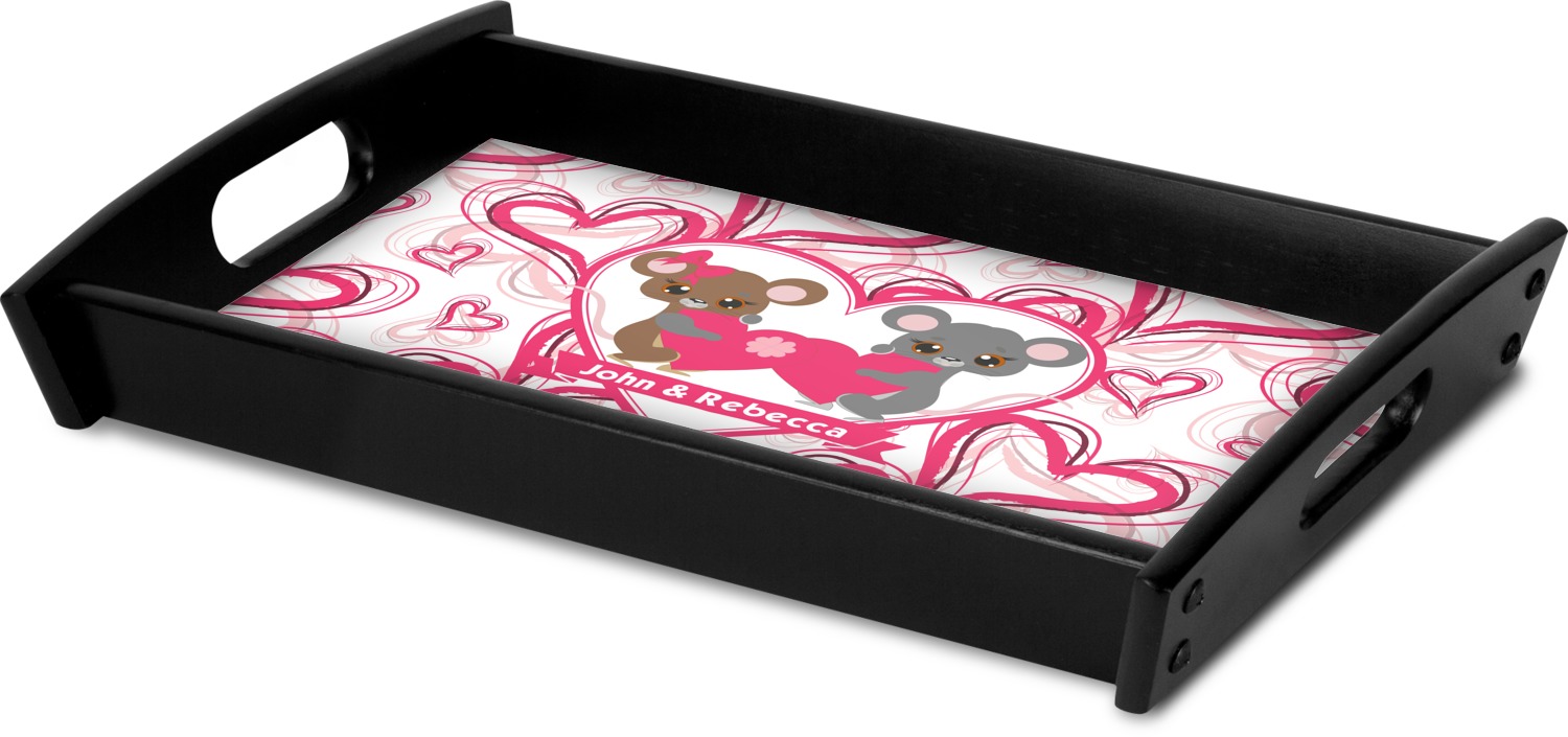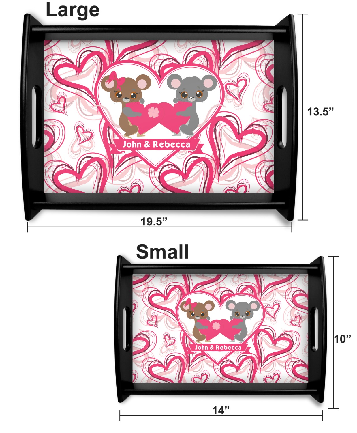 This serving tray with handles features square edges and two rounded sides, creating a very modern look. Each side is fabricated from a beautifully cut, natural wood. The bottom of the interior of the tray displays your customized design in bright, vibrant color. The tray is sold in both a black color and a natural wood look. Each variation of the wood serving tray has two sizes: Small, which is 14" x 10" x 2.25", and Large, which is 19.5" x 13.5" x 2.75".