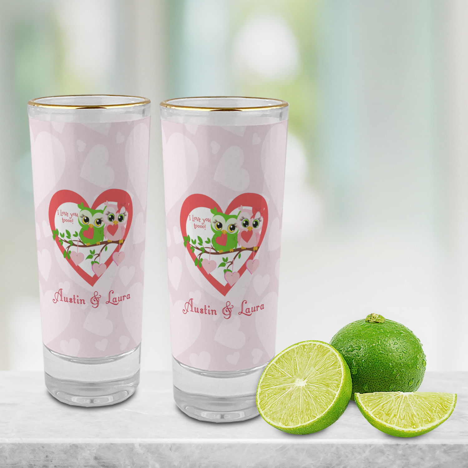 These glass shooter glasses are printed in full color with the design of your choice. These are a tall shooter 2 oz size and stand 4" tall. The print is a full wrap design to boldly display your personalization.