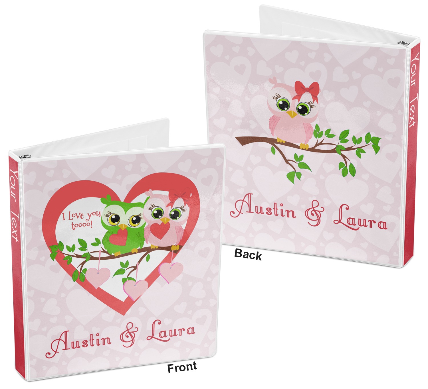 These 3 ring binders are white in color, which is displayed on the inside and edges. Your custom binders feature two folder pockets on the inside to store any loose paper. The round rings open readily through the tabs at the top and bottom of the spine. At 11.5 by 10.4-11.7 inches, your three ring binder is large enough to accommodate your papers and keep them organized. Your personalization is printed on a premium matte media that are inserted into the front, back, and spine.