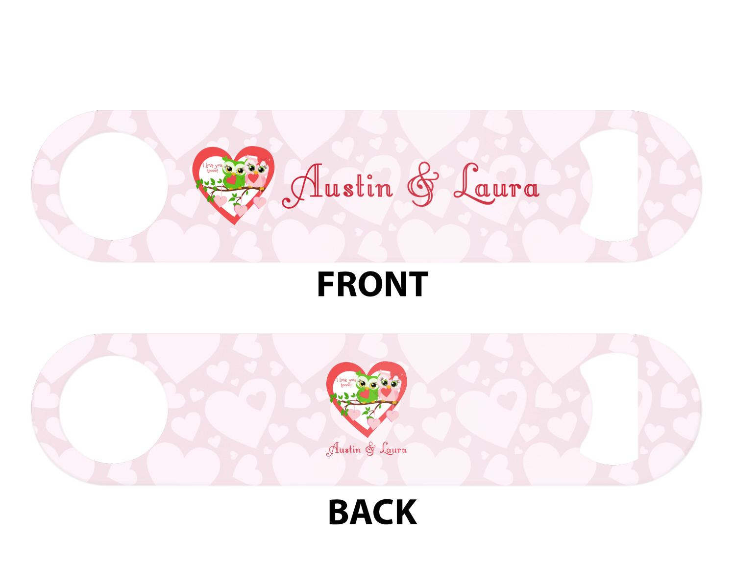 Made from stainless steel, these beer bottle openers are 7 by 1.625 inches, giving you plenty of leverage when trying to open a stubborn bottle. On one end of this personalized bottle opener, you'll find a circular hole for you to hang and display your opener. On the opposite end, you'll find the tool used for opening bottles. This opener in particular has the same structure and style as professional bartender bottle openers. Your customization is sublimated onto both the back and front, and both sides can be customized individually. Choose from one of our two base colors - white or silver.