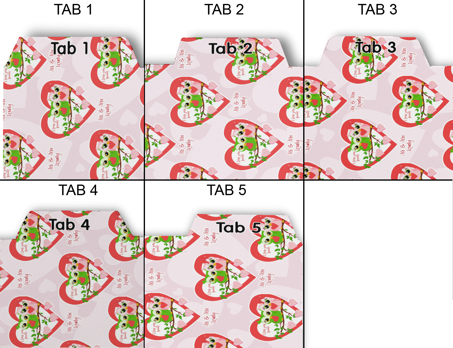Whether you use binders at school or at work, we have designs to suit all of them. Available in 5 or 6 tab sets, you are sure to find a set to suit your needs. The back of each one is white and can be used to take notes, write vital information on, etc.