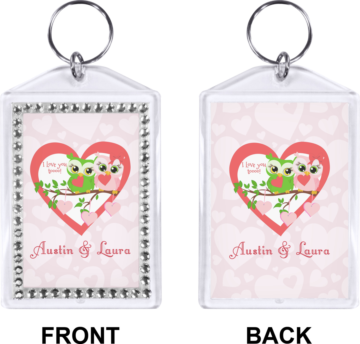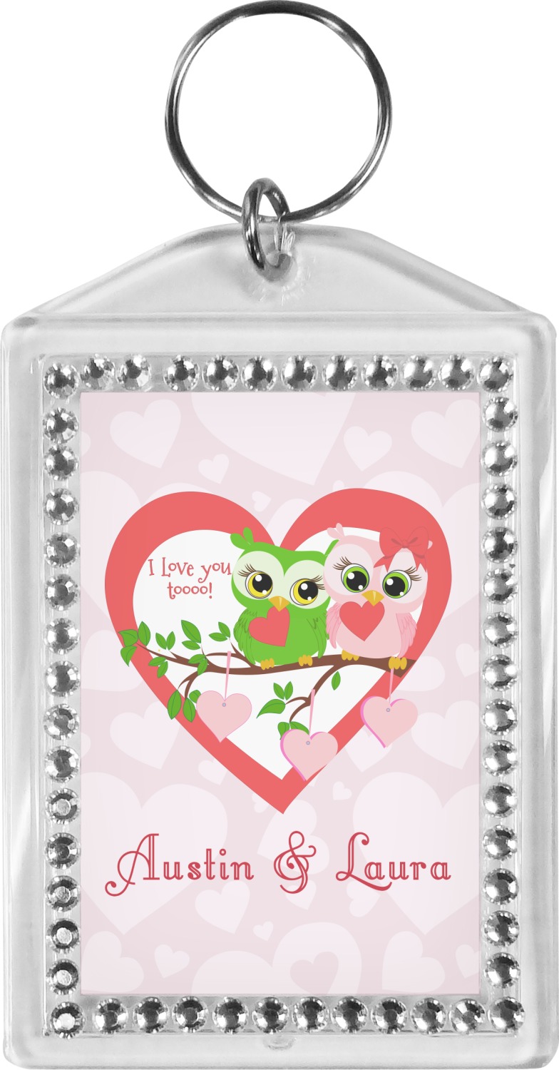 Our personalized keychains have a bold, rectangular shape, outlined by a series of shimmering rhinestones. A metal, split keyring is included with your purchase, and an additional metal hoop allows for attachment of the keychain to the split ring. This unique keychain measures at about 3.75 by 2.5 inches. We print your customized design(s) across both the back and front of this keychain.