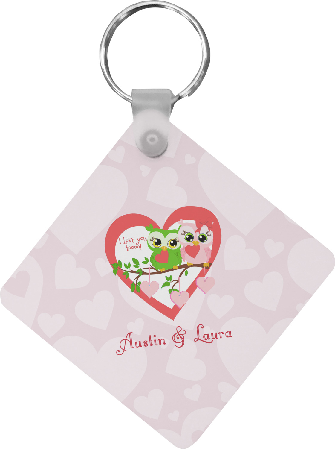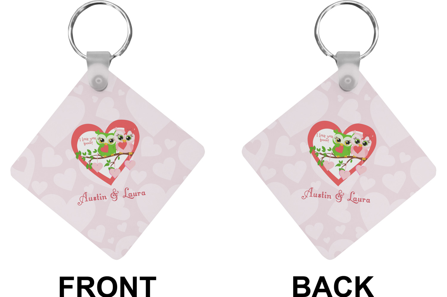 Our personalized keychains attach to the included metal, split key ring with a plastic, removable snap. Since a metal ring is included with your purchase, you have the liberty to keep your keys together on the ring, with or without your unique keychain. We offer this keychain in three different shapes: circle, heart, or diamond. We print your personalized design(s) on both sides of the key chain, and the surface has a glossy, reflective finish that only emphasizes your design. Each keychain is approximately 2.25 by 2.25 inches.