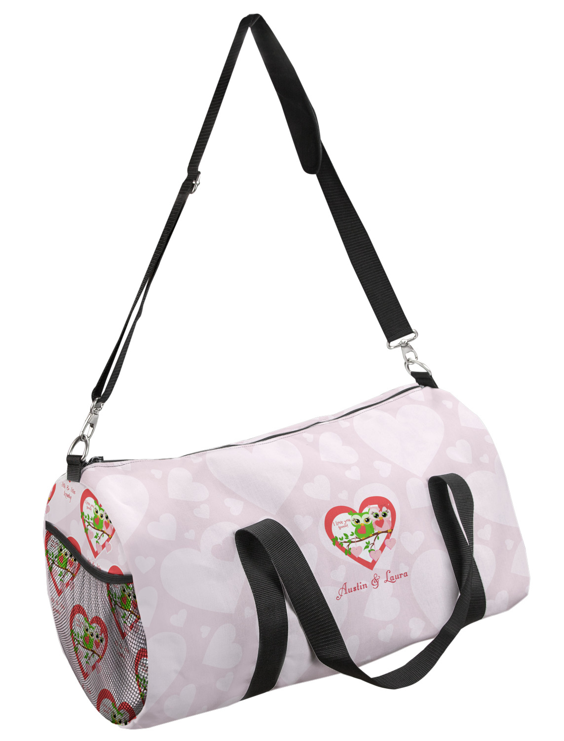 This duffle is a sturdy bag made of a canvas material. It comes in two sizes: Small (19"W x 9.5"H x 9.5"D) and Large (23"W x 12"H x 12"D). The bag is a cylindrical shape with a black adjustable strap and two handles. On one side is an elastic pouch to put a waterbottle or other small item. Your product will be sublimated with your design and is able to be designed on the front, back, and sides. Be sure to remember that the straps may cut into parts of your design if you upload your own artwork.