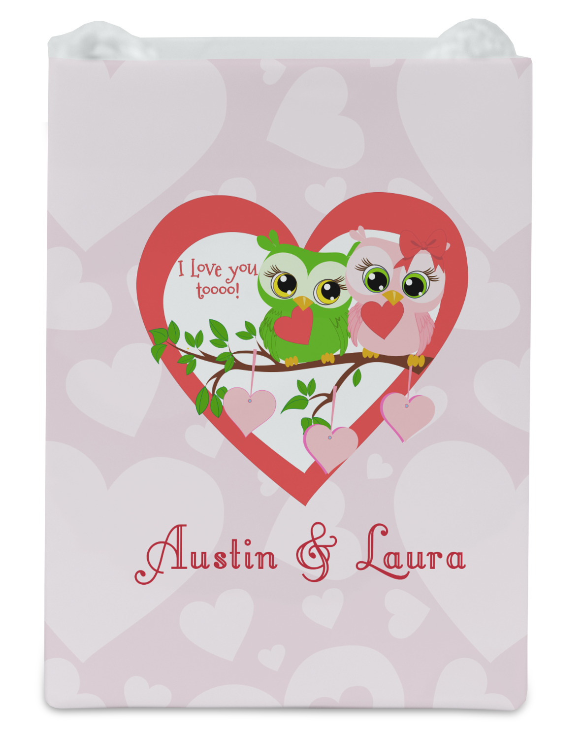 This sweet design, complete with adorable owls hooting to each other, "I love you toooooo!," is sure to make her heart melt. With white hearts on a pale pink background, it is just perfect for Valentine's Day.