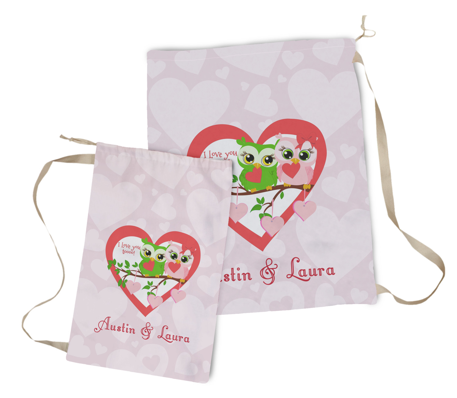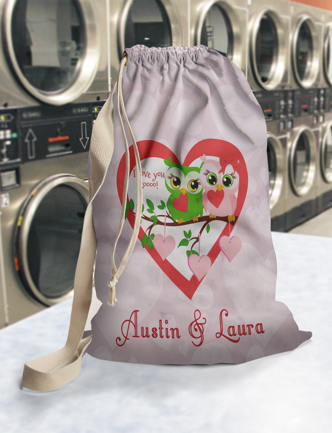 Carry your laundry in style with these customized laundry bags. Available in two sizes, featuring a natural colored woven strap and a cinch cord, these bags hold a lot of clothes or anything else you want to fit in them.