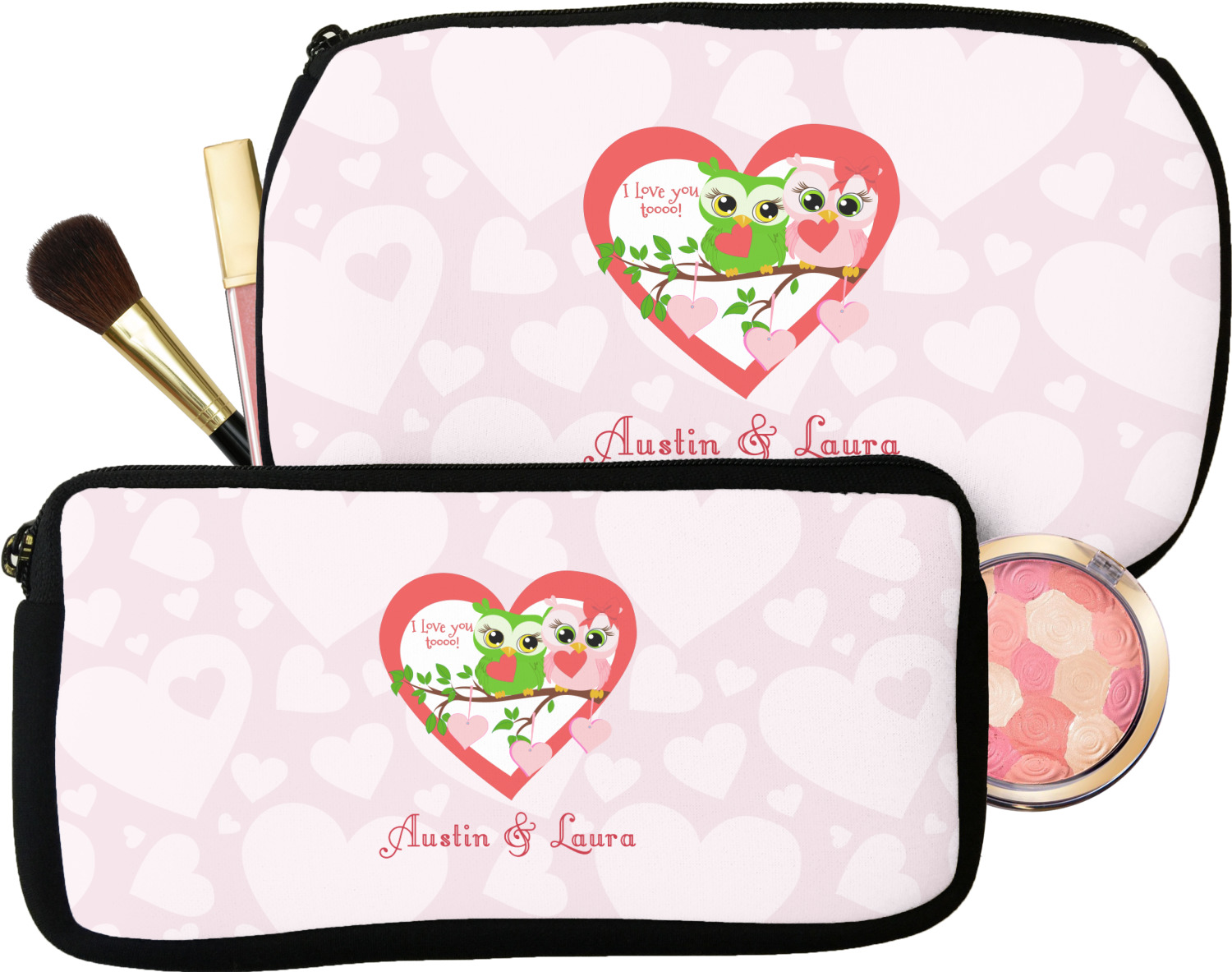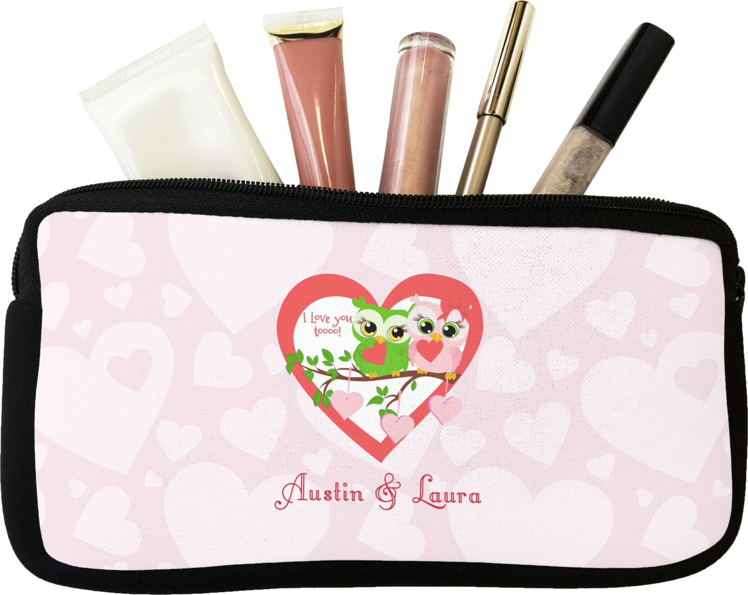 Our personalized makeup bags are available in many different designs, patterns and colors - so you are sure to find one that will love. They are made of neoprene (same material as wet-suits) and thus are water resistant, so spillages in your makeup bag will not end up all over you purse. They are customized on one side and are black on the other side and the zipper is black as well.