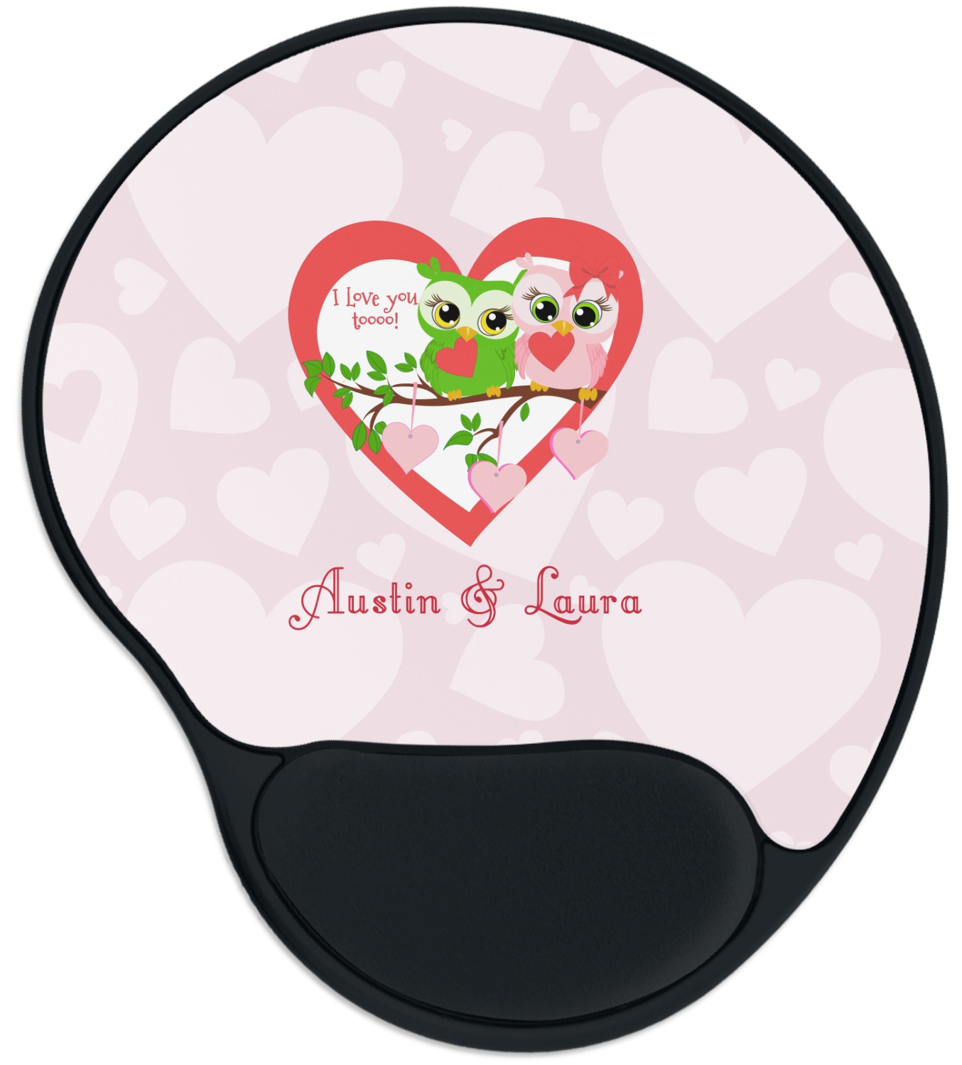 The top of these personalized mouse pads are made from a polyester, while the underside is plastic. The back of these mouse mats include rubber feet to prevent any slippage while in use. A padded wrist support, made from plush memory foam, occupies the bottom section of these computer mouse pads. Your customized design is printed onto the face of this mat, with the remaining sides and support piece colored in black. The mat itself is rounded and measures at 10.25" x 9.13".