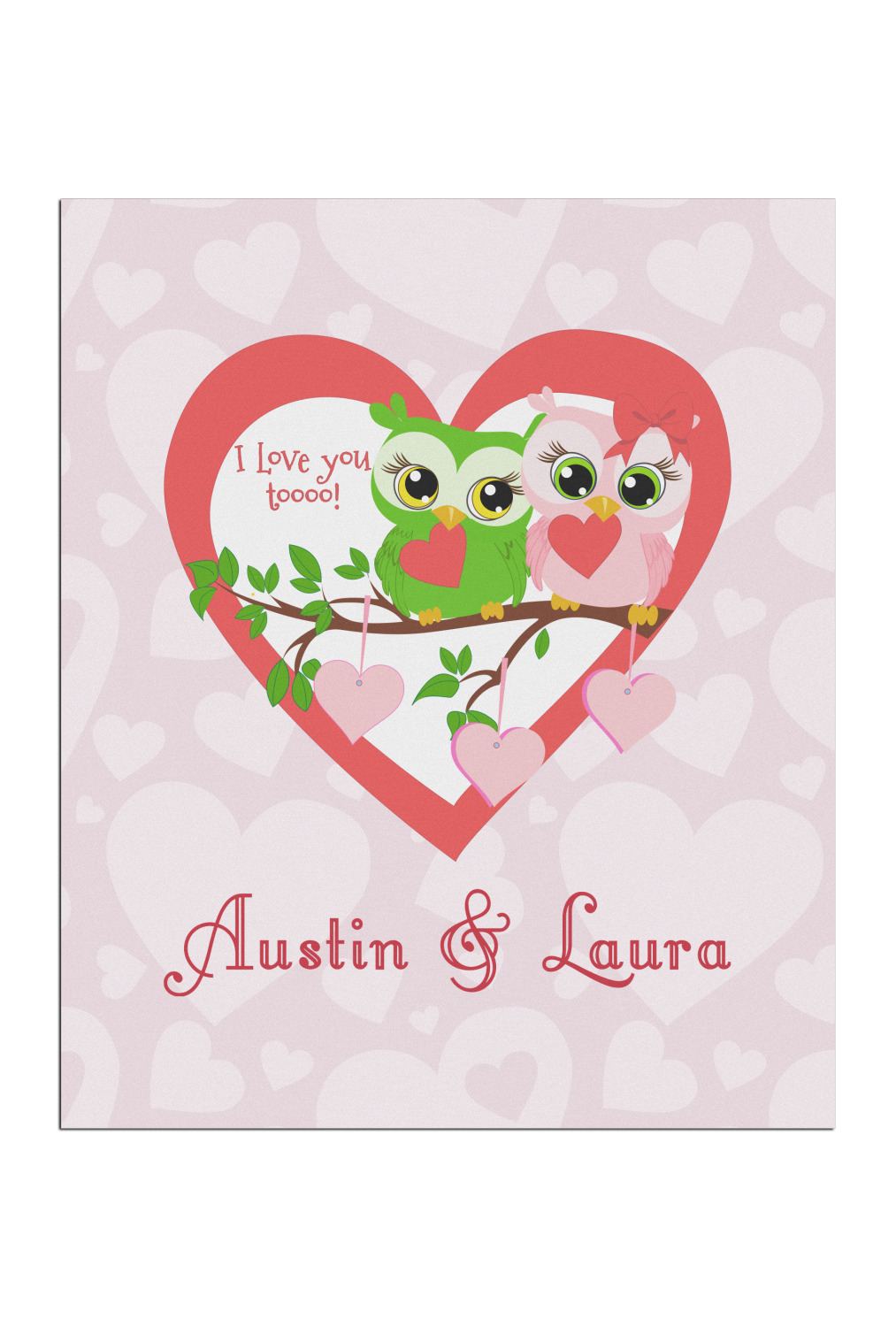 This sweet design, complete with adorable owls hooting to each other, "I love you toooooo!," is sure to make her heart melt. With white hearts on a pale pink background, it is just perfect for Valentine's Day.