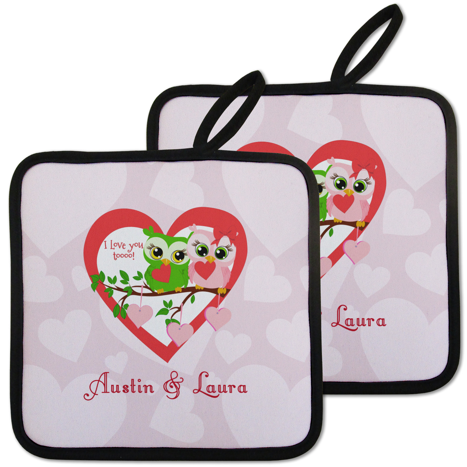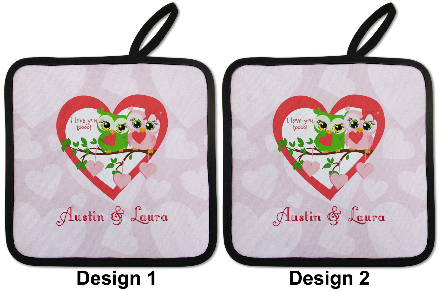Our personalized pot holders feature a neoprene front that displays your personalization in vibrant colors. The backing of the hot pot holder is rubberized; the textured backing allows you to have a great grip when using this custom pot holder. The two materials are joined with a sleek, black trim, and the holder also includes an attached loop for hanging and storage. The pot holder is approximately 8.75 inches by 8.75 inches and 0.25 inches tall, while the fabric loop is 2.5 inches long. You can purchase a kitchen pot holder by itself or as a set of 2. We also offer a set including one pot holder and one oven mitt.