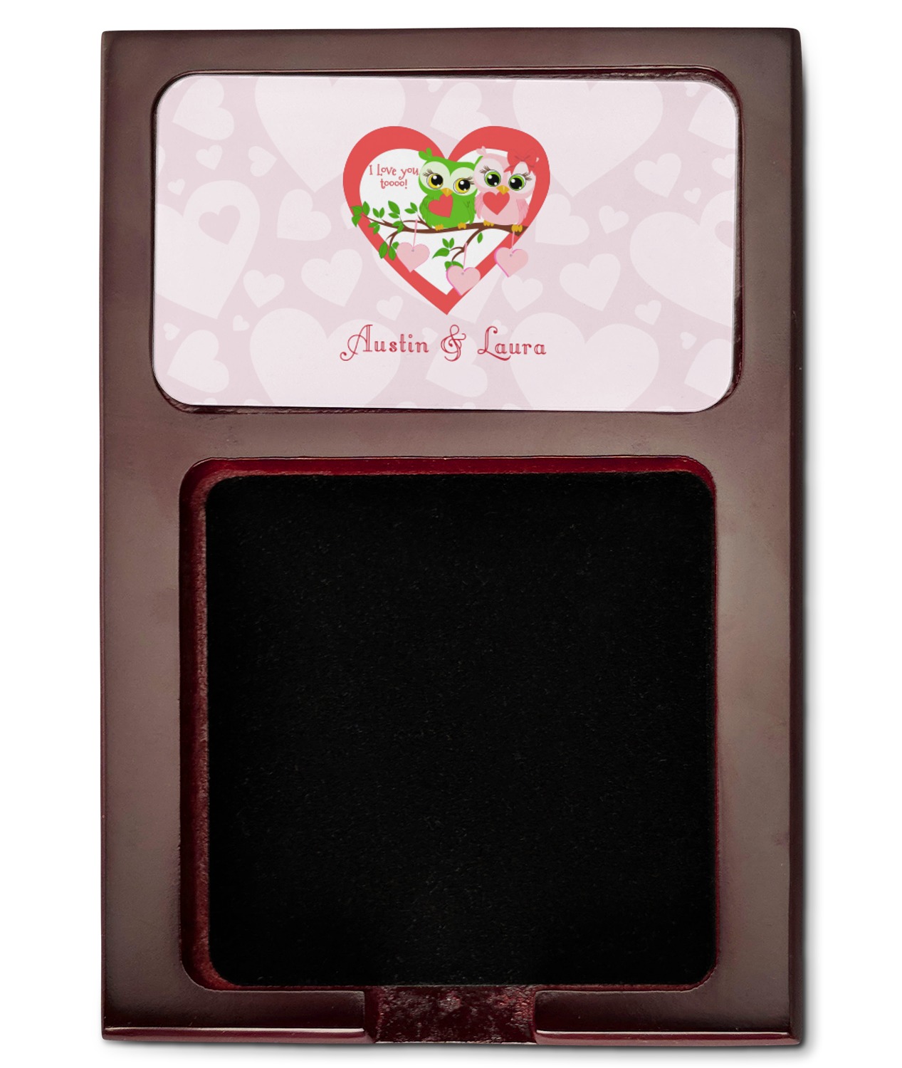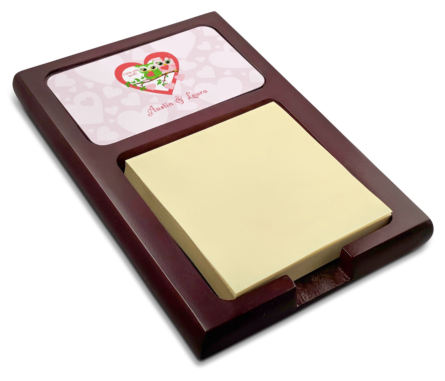 Crafted from a fine mahogany, this post it note holder is in the shade of a dark, cherry color. The dispenser itself is about 4.25 by 6.25 by 0.75 inches. You can place your 3 by 3 inch sticky notes in the indentation below the nameplate. We print your customization onto the nameplate that rests above the velvety indentation.