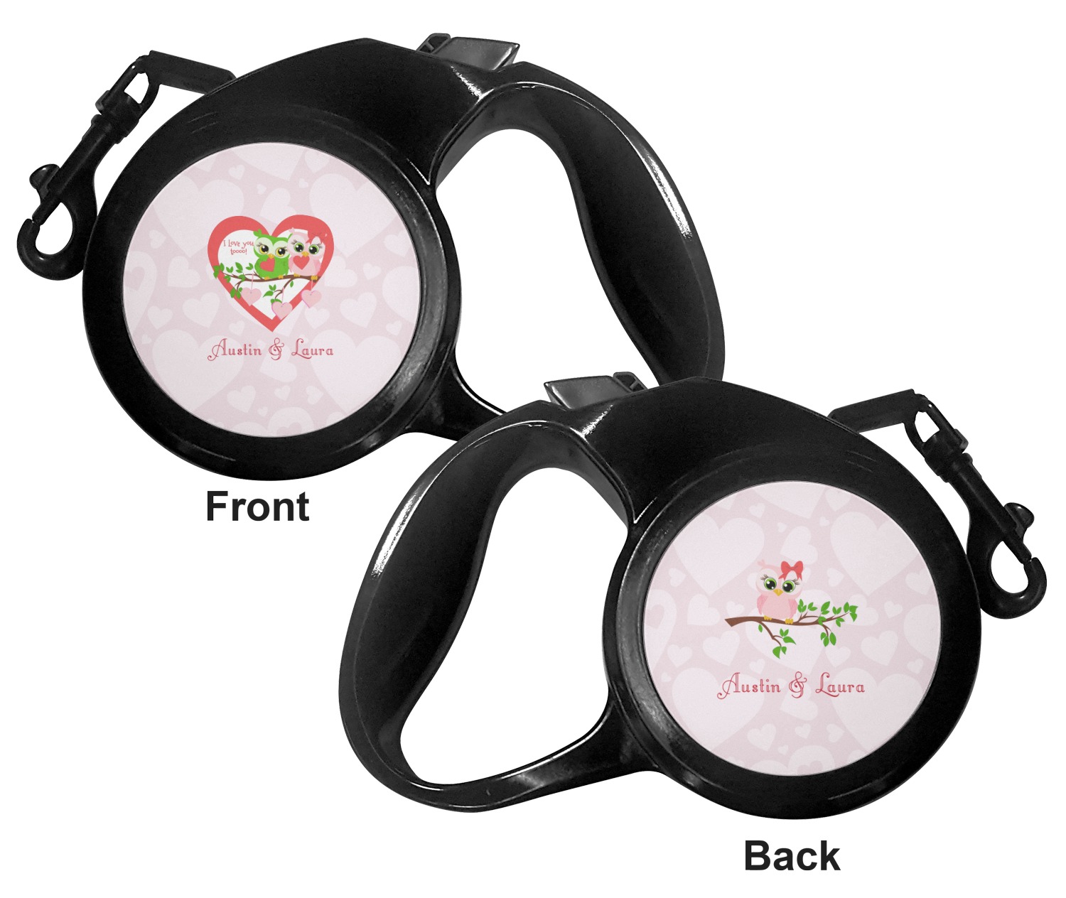 The leash's plastic handle is accommodating of your grip and displays your customization on both sides. The dog leash also features the traditional bolt snap clip, for easy fastening to your dog's collar. The leash and leash handle themselves are both black in color.