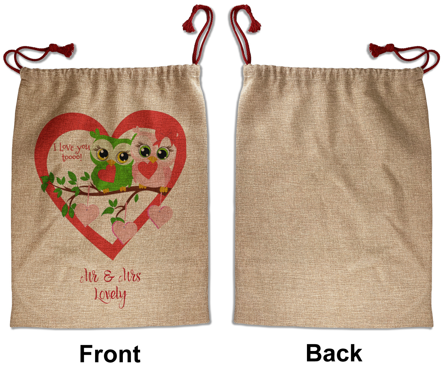 Our Santa sacks print your design on the burlap material giving it a nice rustic, natural design! The burlap material is also machine washable and wrinkle-free, so feel free to fold and store out Santa bags until the next time you need it! Secure your gifts with our red accent drawstring ties at the top of the sack so the mystery of your gift stays a surprise until Christmas day. We offer two types of printing- one side partial print or double-sided partial printing. Design and personalize your own Santa sack in time for the holidays!