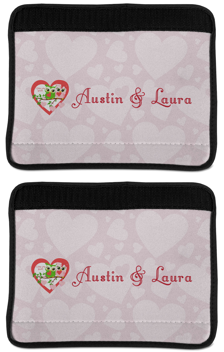 Made from neoprene, our seat belt strap covers wrap around the belt itself and have a Velcro tab for easy attachment and closure. The belt's edges are trimmed with a black polyester for a secure finish. Each cover is 9.5 by 7 inches when open and 9.5 by 2.5 inches when closed. We print your personalized design on the face of the seat belt pad.