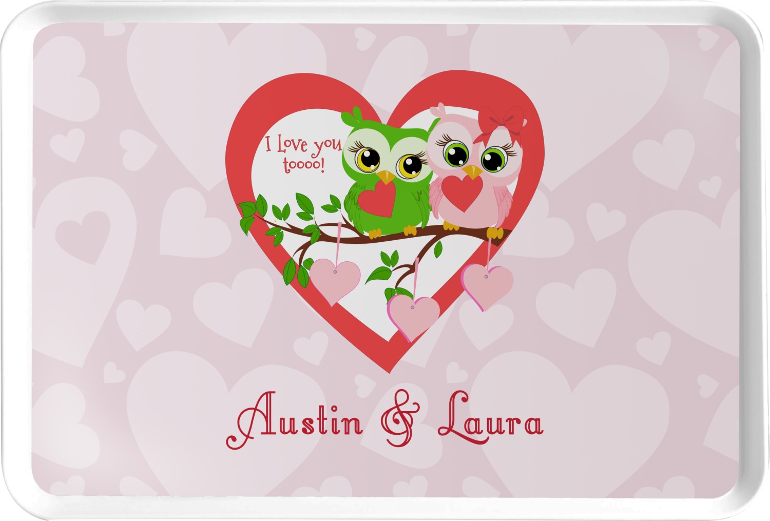 This sweet design, complete with adorable owls hooting to each other, "I love you toooooo!," is sure to make her heart melt. With white hearts on a pale pink background, it is just perfect for Valentine's Day.