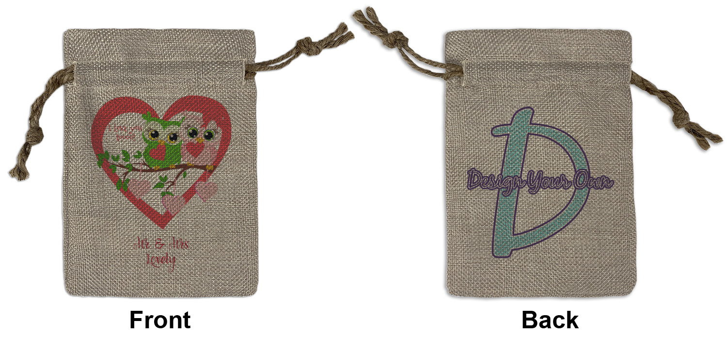 We sell our Burlap Gift Bags in 3 variant sized bags. Made with burlap polyester, each personalized bag can be secured with a twine drawstring pull. Your custom design is available to print on one side or both sides - completely up to you! The sizes of the bags measure approximately 4.5" x 6.5" for the smallest size, 6.5" x 8.0" for the medium size, and 6.5" x 13.5" for the large-sized bag.