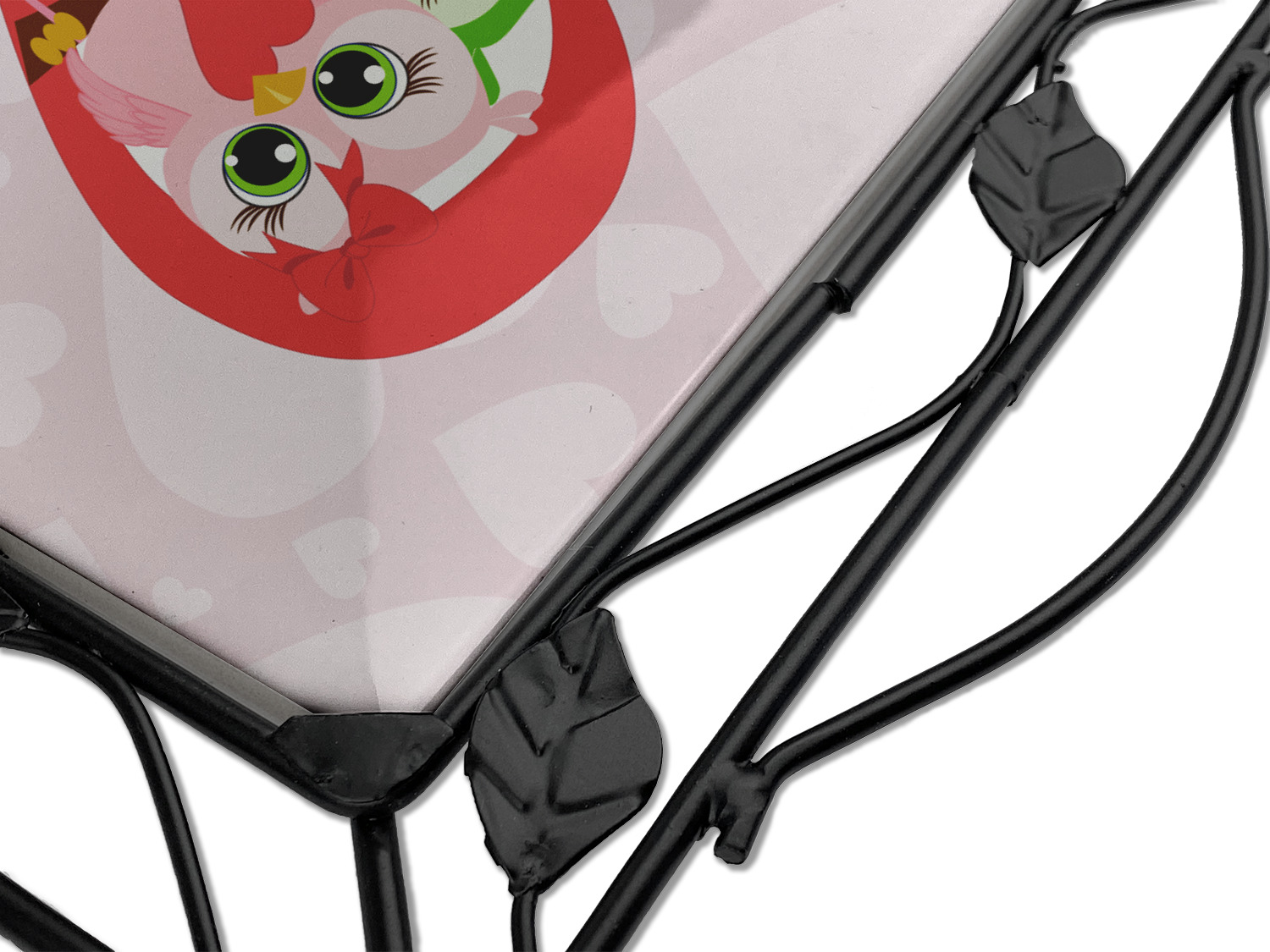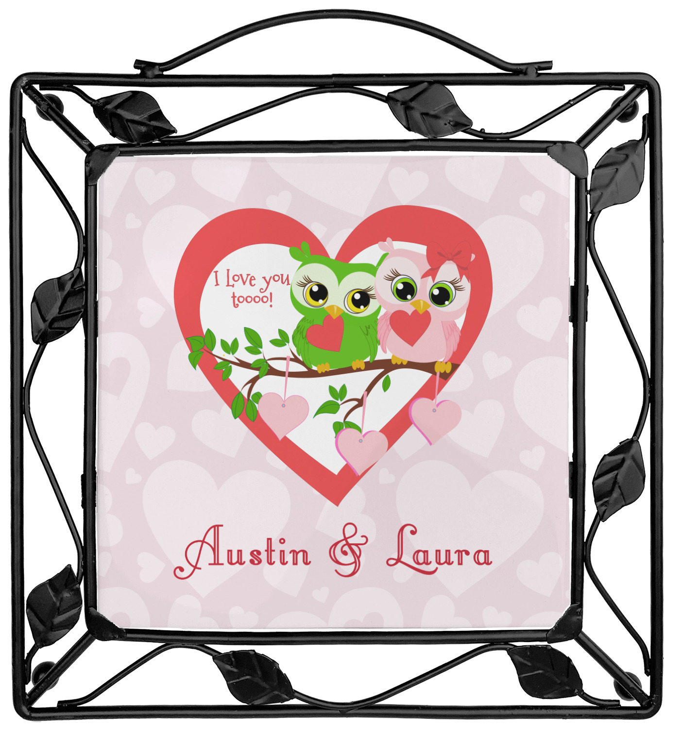 Our square trivets are made from a durable, wrought iron. This model features 4 small half circles, one on each corner, and a larger ring of iron that circles the central, customized tile. Each of the 4 corners has a round foot on its bottom for stability. This trivet is 8.75 by 8.75 inches, but the central tile measures at 6 inches on both sides.
