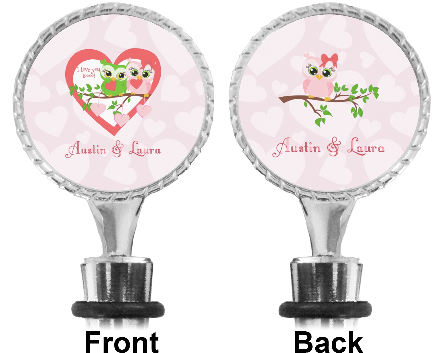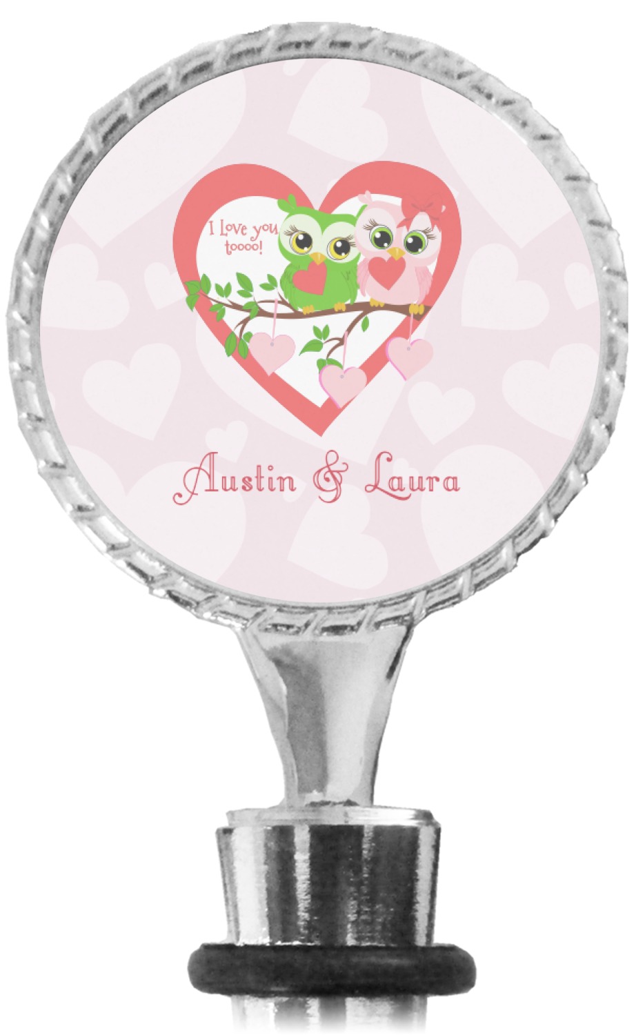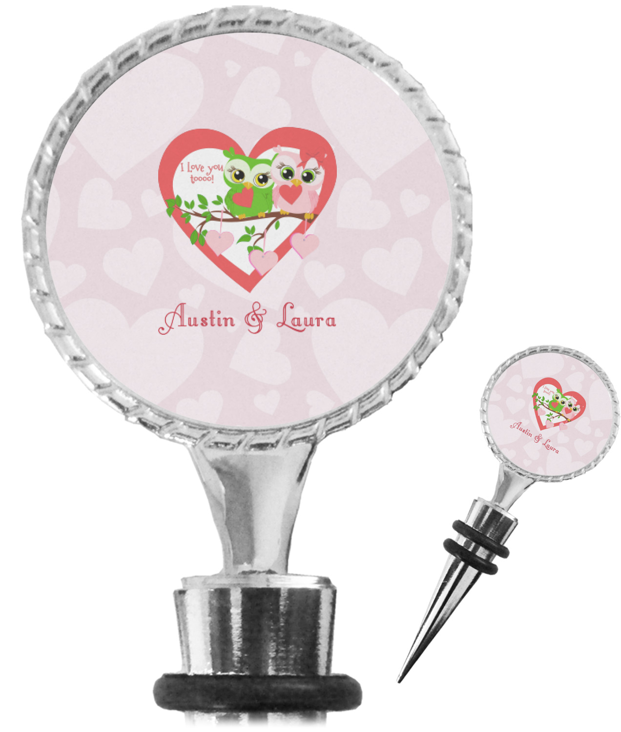 The top part of your bottle stopper is comprised of a zinc ring that displays your customization(s) in its middle, on both sides. The ring is heavy duty, with a bright chrome finish. The body of the wine stoppers have two silicone rings to provide an airtight seal. These wine bottle stoppers measure at 1.625" L x 0.8125" W x 4.625" H; your custom wine stopper is meant to fit into most standard-sized wine bottles.